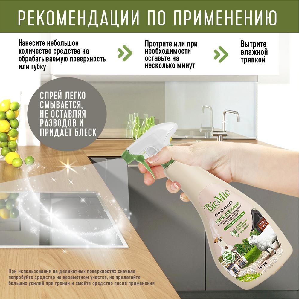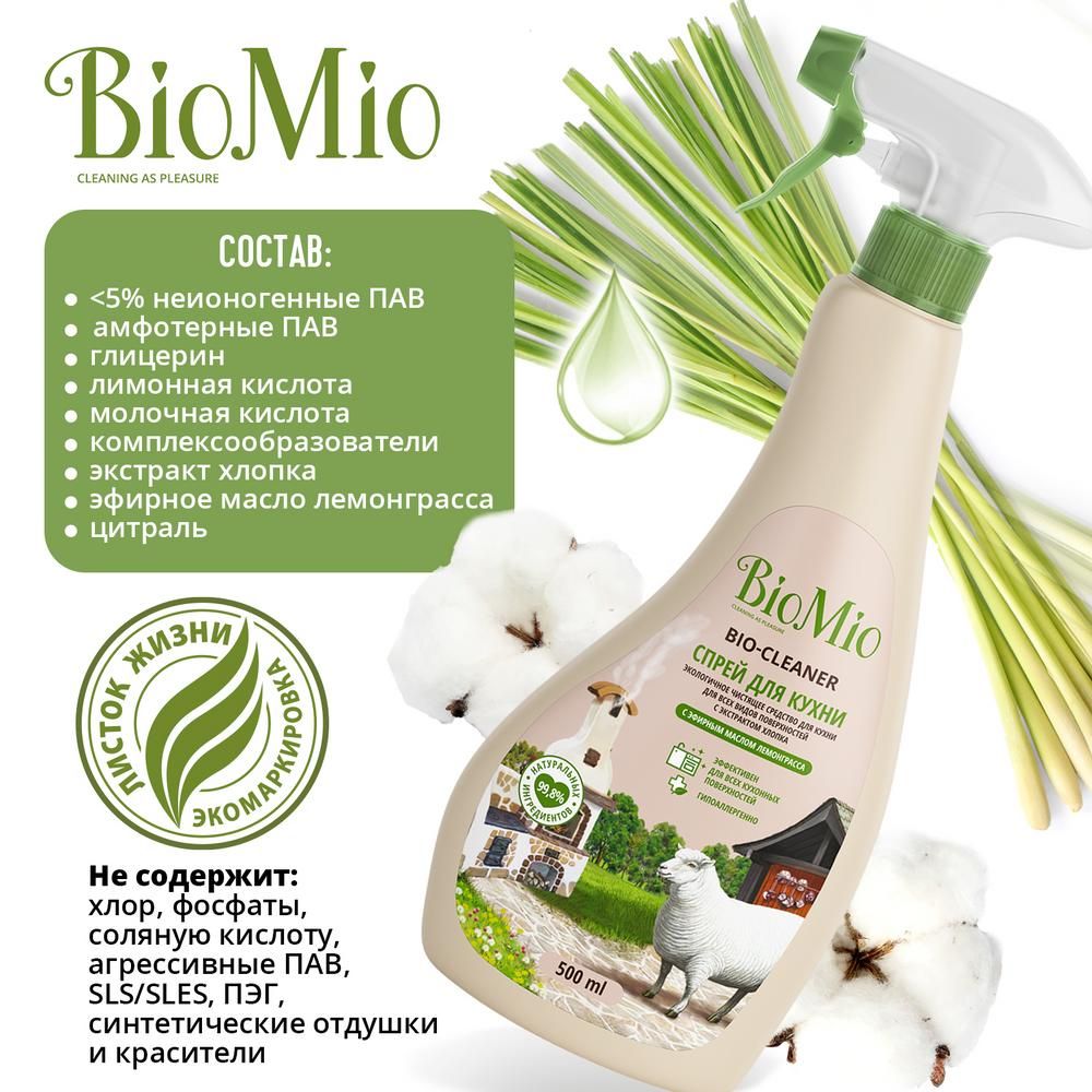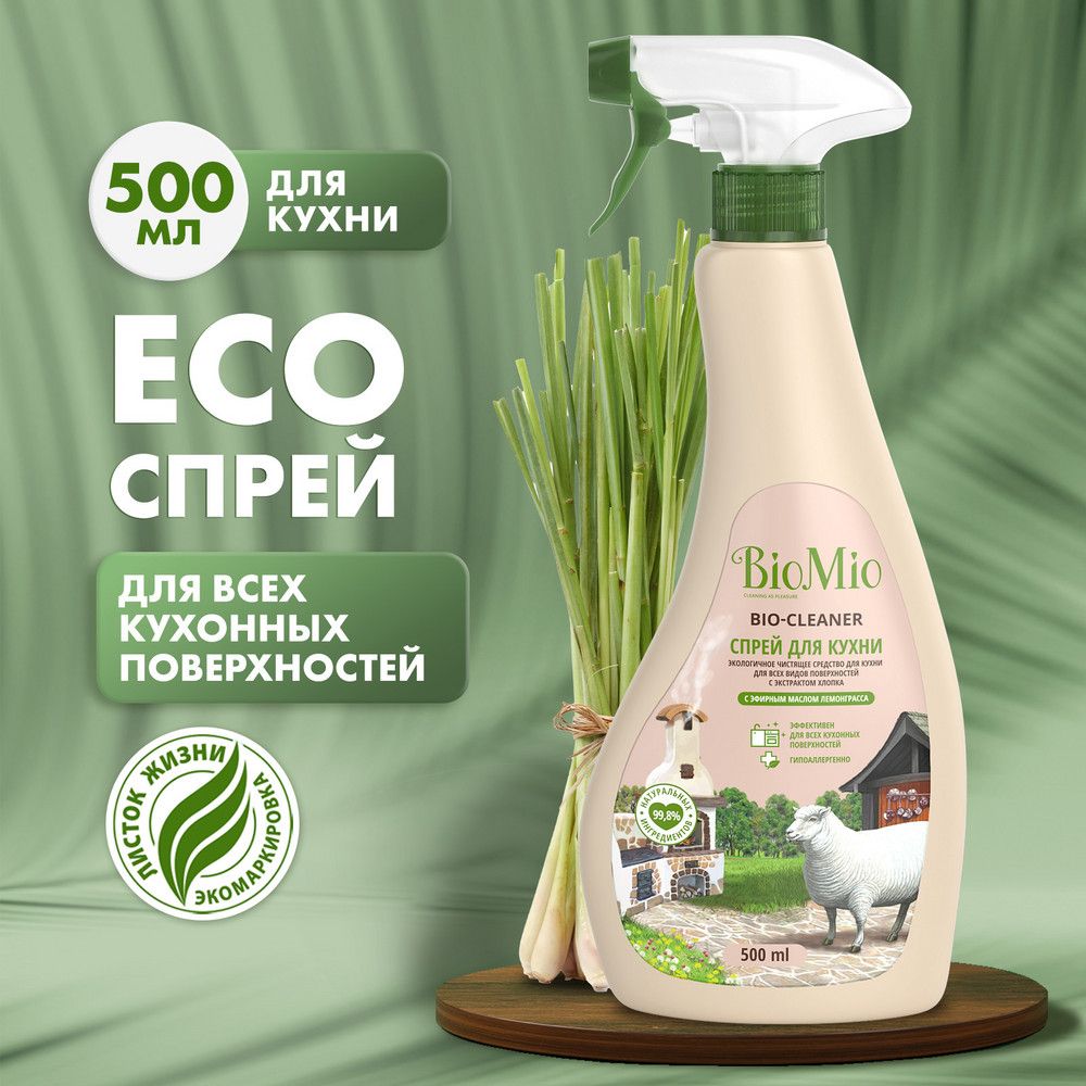 Гипоаллергенное чистящее эко средство спрей для кухни BioMio, с эфирным маслом лемонграсса, 500 мл в ИМ Санвэй удаляет жир и известковый налет со столешниц, бытовой техники, варочных панелей, раковин, сковород и противней. Спрей легко смывается, не оставляя разводов.