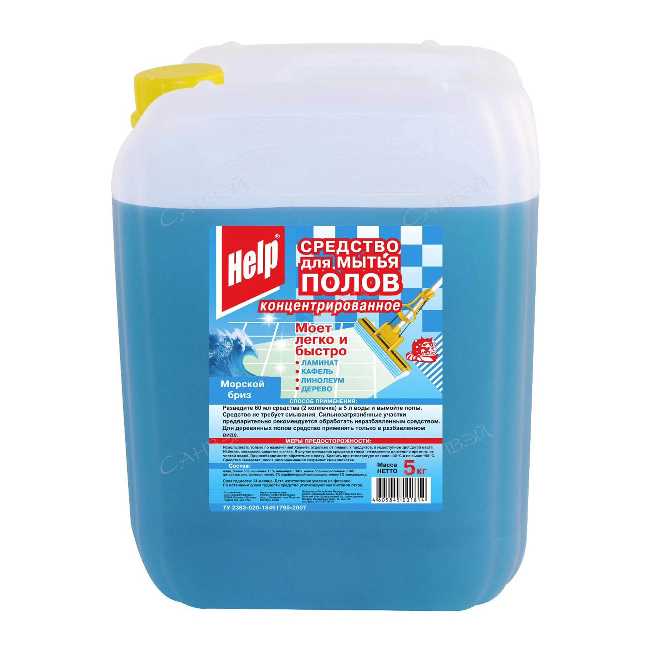 Help Концентрат для мытья полов Морской бриз 5 л предназначен для ухода за полами различного типа: паркета, ламината, линолеума, кафеля. Состав способен эффективно удалять разнообразные загрязнения, не наносит вреда поверхности, не оставляет разводов или подтеков. Не требует смывания. При использовании для мытья паркета обязательно разбавлять. Концентрированная формула обеспечивает экономичный расход.