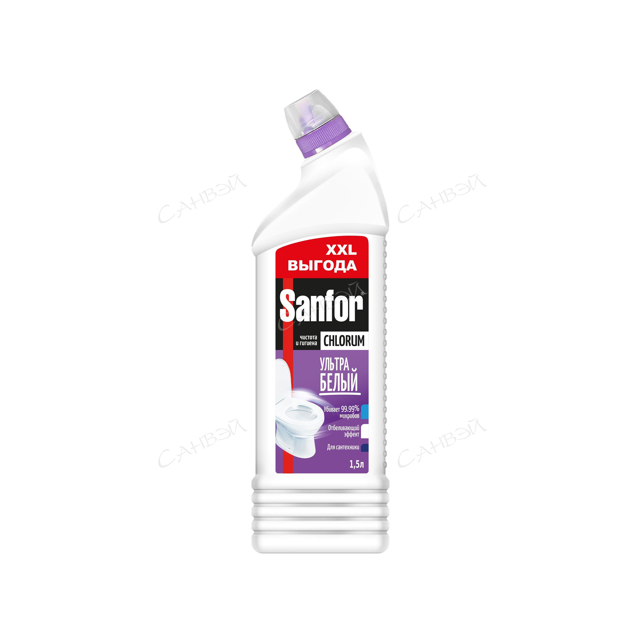 Sanfor Гель чистящий для сантехники Chlorum 1.5 л для удаления даже самых стойких загрязнений и неприятных запахов в туалете. Предотвращает появление известкового налета, солевых отложений, ржавчины и других загрязнений, но и обладает дезинфицирующим эффектом, уничтожая 99,9% бактерий и микробов.