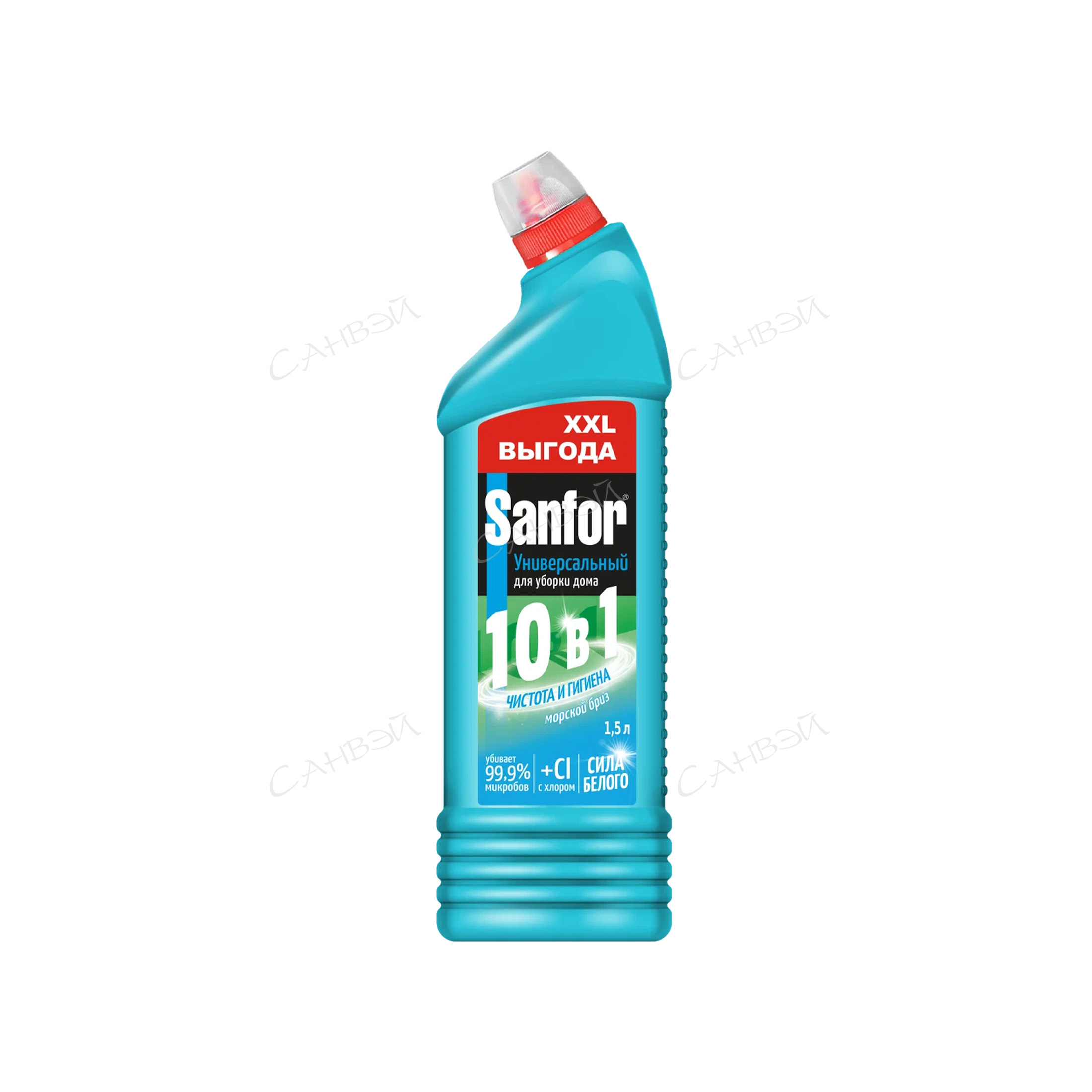 Sanfor Гель чистящий для сантехники 10в1 Universal Морской бриз 1.5 л - универсальное чистящее средство для эффективной и быстрой очистки различных поверхностей в вашем доме. Он идеально подходит для уборки ванной, душевой кабины, унитаза, раковины, плитки и напольных покрытий, а также поверхностей на кухне.