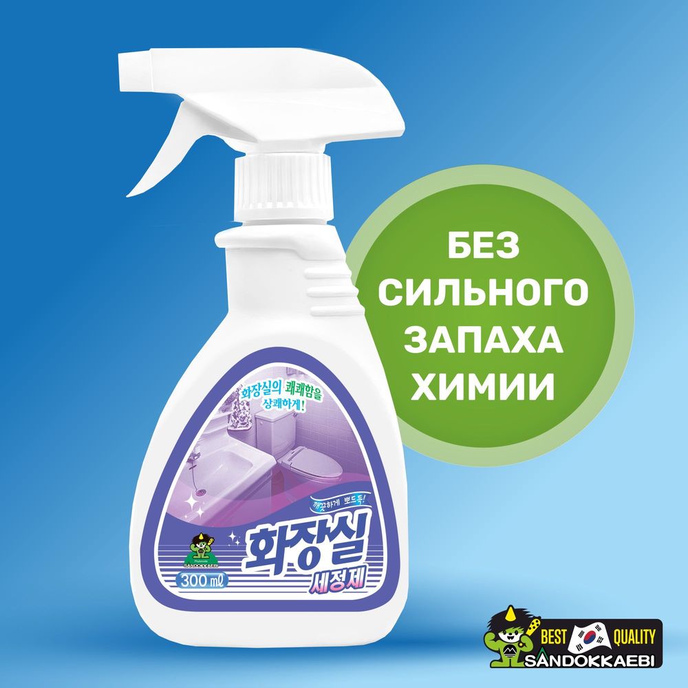 Чистящий спрей для туалета Sandokkaebi 300 мл эффективно удаляет въевшиеся пятна с поверхностей унитаза, а так же устраняет неприятные запахи, борется с ржавчиной и налётом. Средство дезинфицирует и предотвращает рост бактерий. Спрей подходит для лёгкой ежедневной уборки, не оставляет разводов. Распылитель позволяет равномерно нанести средство на поверхность. В составе средства нет хлора.