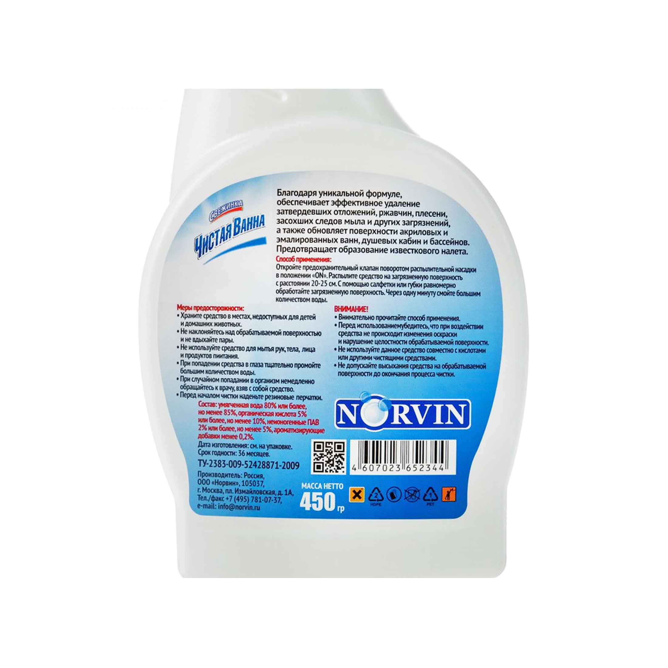 Благодаря уникальной формуле очищающего спрея Свежинка, обеспечивает эффективное удаление затвердевших отложений ржавчины, плесени, засохших следов мыла и других загрязнений, а также обновляет поверхности акриловых и эмалированных ванн, душевых кабин и бассейнов. Придает очищенной поверхности долговременный блеск. Предотвращает образование известкового налета.