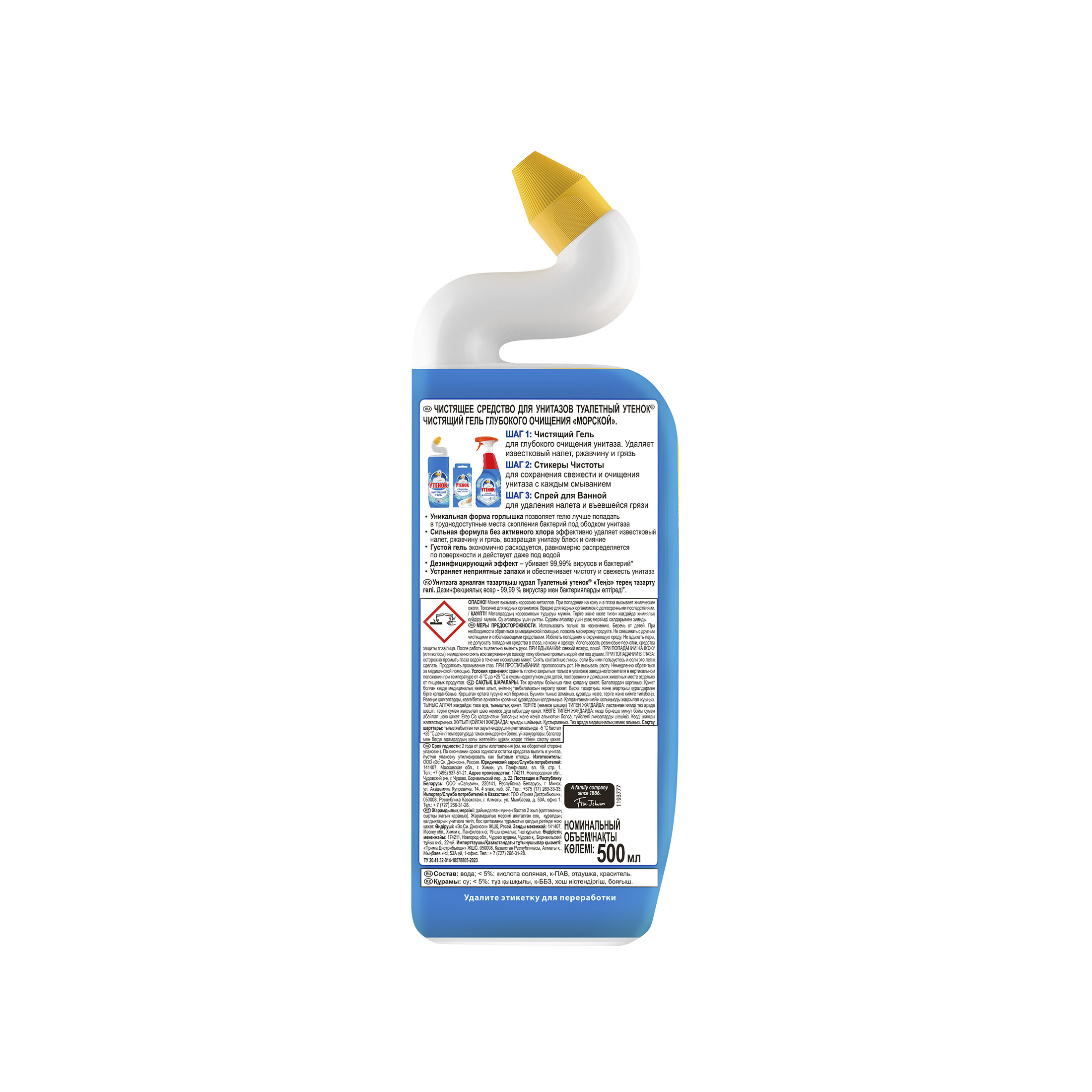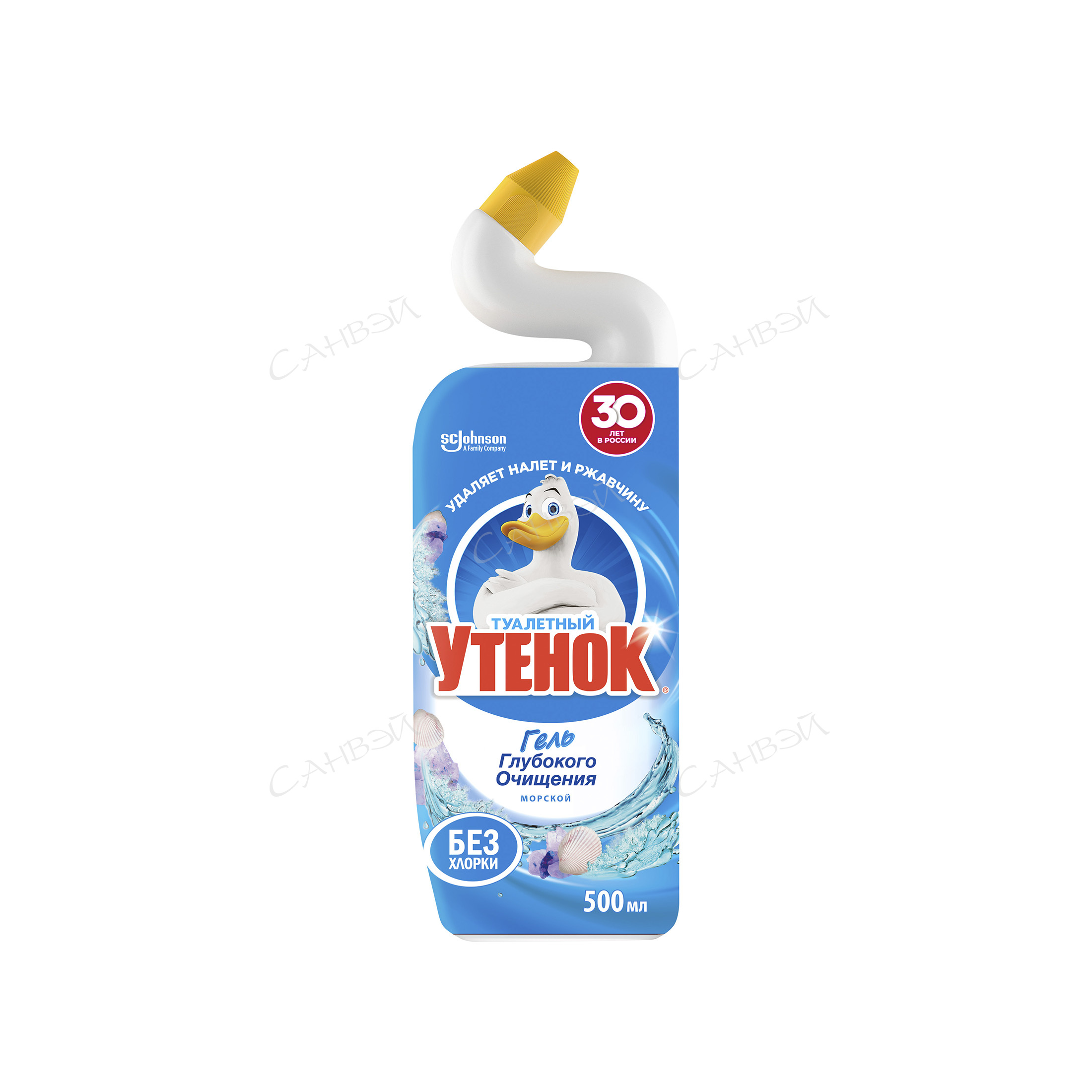 Чистящее средство Туалетный утенок Морской 500 мл эффективно и быстро справляется с известковым налетом и другими загрязнениями в санузле. Средство обладает выраженным свежим ароматом, который помогает устранить неприятные запахи. Жидкость окрашена в яркий голубой цвет с добавлением микрочастиц - они помогают быстрее устранить загрязнения. Необходимо залить "Туалетный утенок" в водосток на некоторое время. Чтобы распределить его по всей поверхности, рекомендуется использовать туалетный ершик.