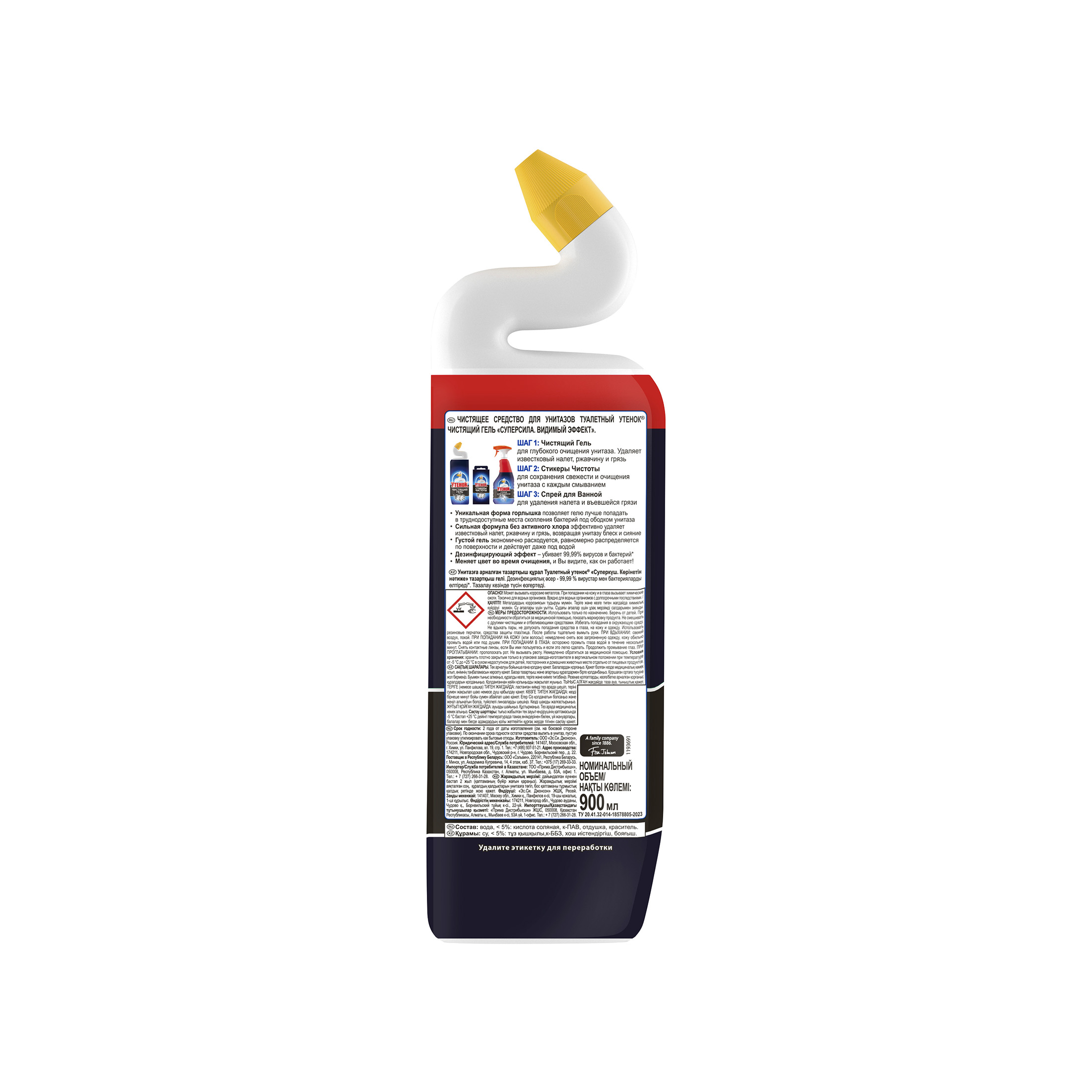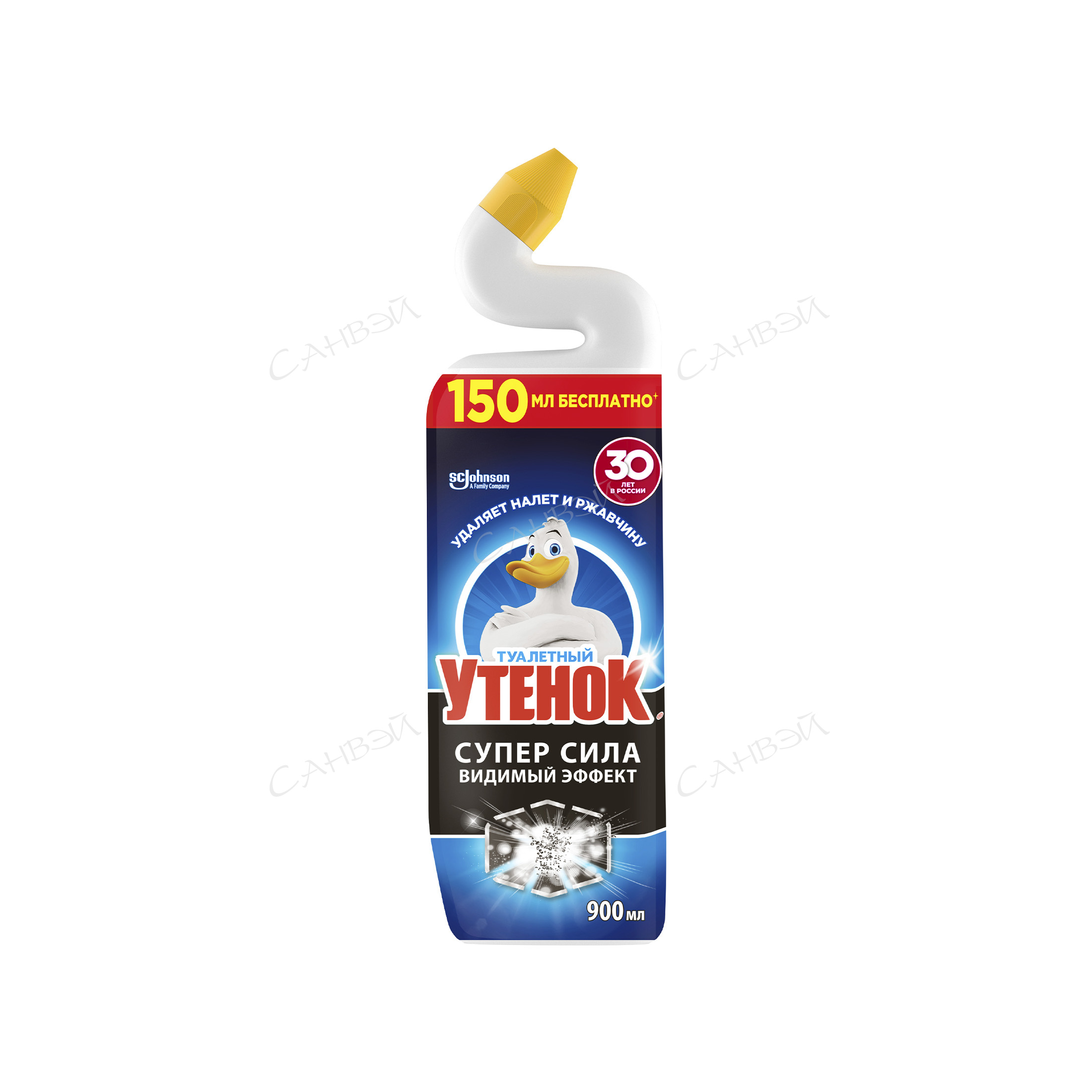 Туалетный Утенок Чистящее средство Супер Сила Видимый Эффект 900 мл убивает 99,9 % микробов. Удаляет самые стойкие пятна и до 100% известкового налета. Меняет цвет во время очищения. Эффективен даже под водой. Удобная форма бутылки позволяет использовать средство даже в труднодоступных местах, например, под ободком унитаза. Экономичен. Специальная конструкция колпачка не позволяет детям открывать упаковку.