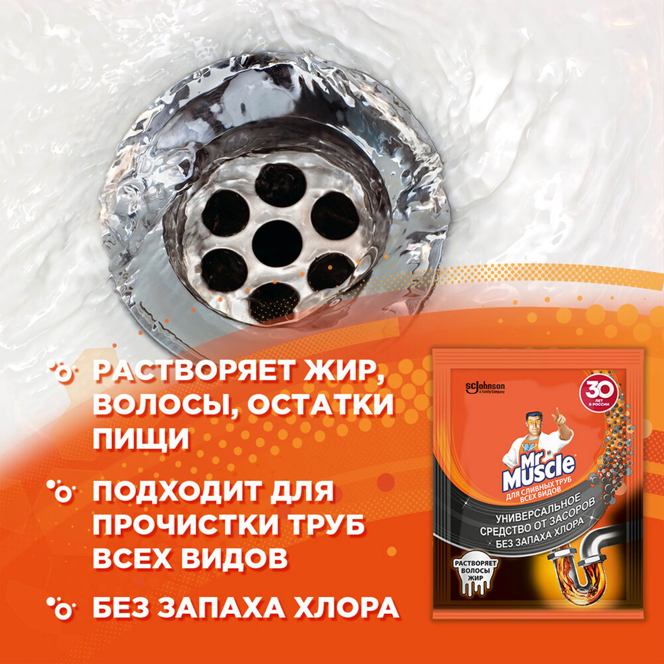 Mr Muscle Средство для прочистки труб от засоров 70 г полностью прочищает засоренные и слабопроходимые сливные трубы. Уничтожает микробы и устраняет неприятные запахи. Растворяет жиры, волосы и остатки пищи, не повреждая труб. Подходит для всех видов труб. Время действия 30 минут.