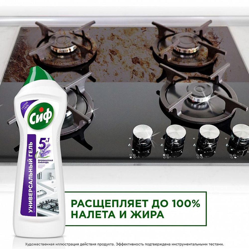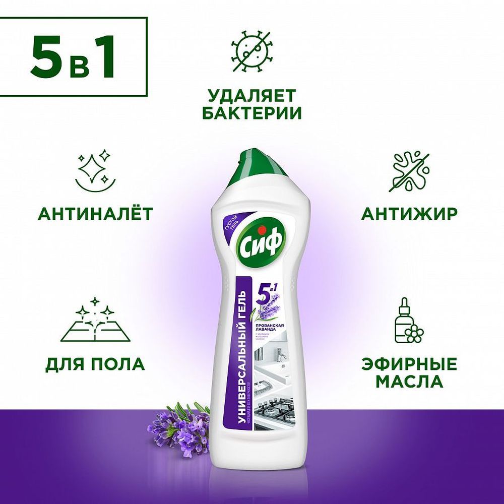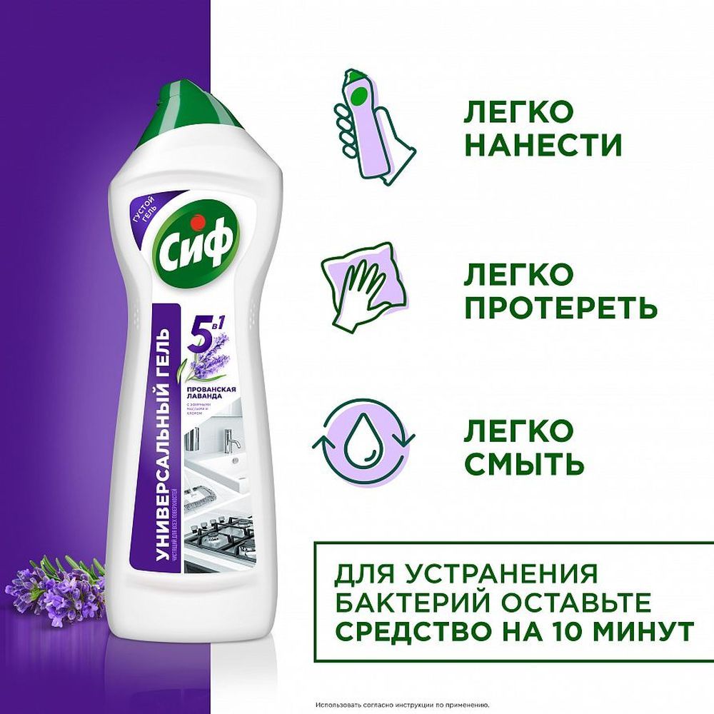 Чистящий гель Прованская лаванда Сиф Универсальный 750 мл эффективно и бережно удаляет любые виды загрязнений на кухне, полу и ванной! Гель не только борется с налетом и въевшимся жиром, но и обладает антибактериальным эффектом. Инновационная формула позволяет легко смывать средство. Легко нанести, легко протереть, легко смыть! Благодаря эфирным маслам в составе, гель обладает приятным ароматом.