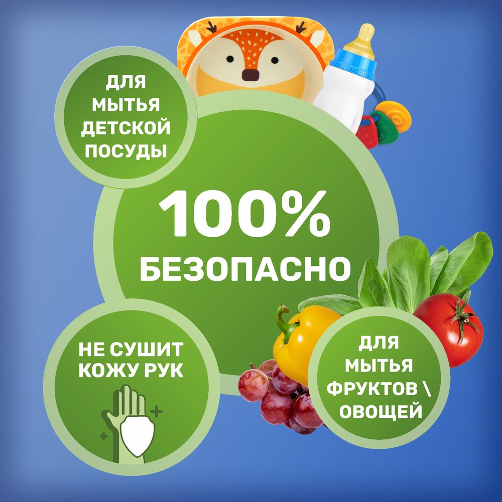 Нанести небольшое количество средства на губку, помыть посуду, затем тщательно ополоснуть водой. Овощи, фрукты мыть раствором 5мл средства (чайная ложка) на 5л воды. Не допускать замачивания овощей и фруктов более, чем на 5 минут. Вымытые продукты ополоснуть в проточной воде.