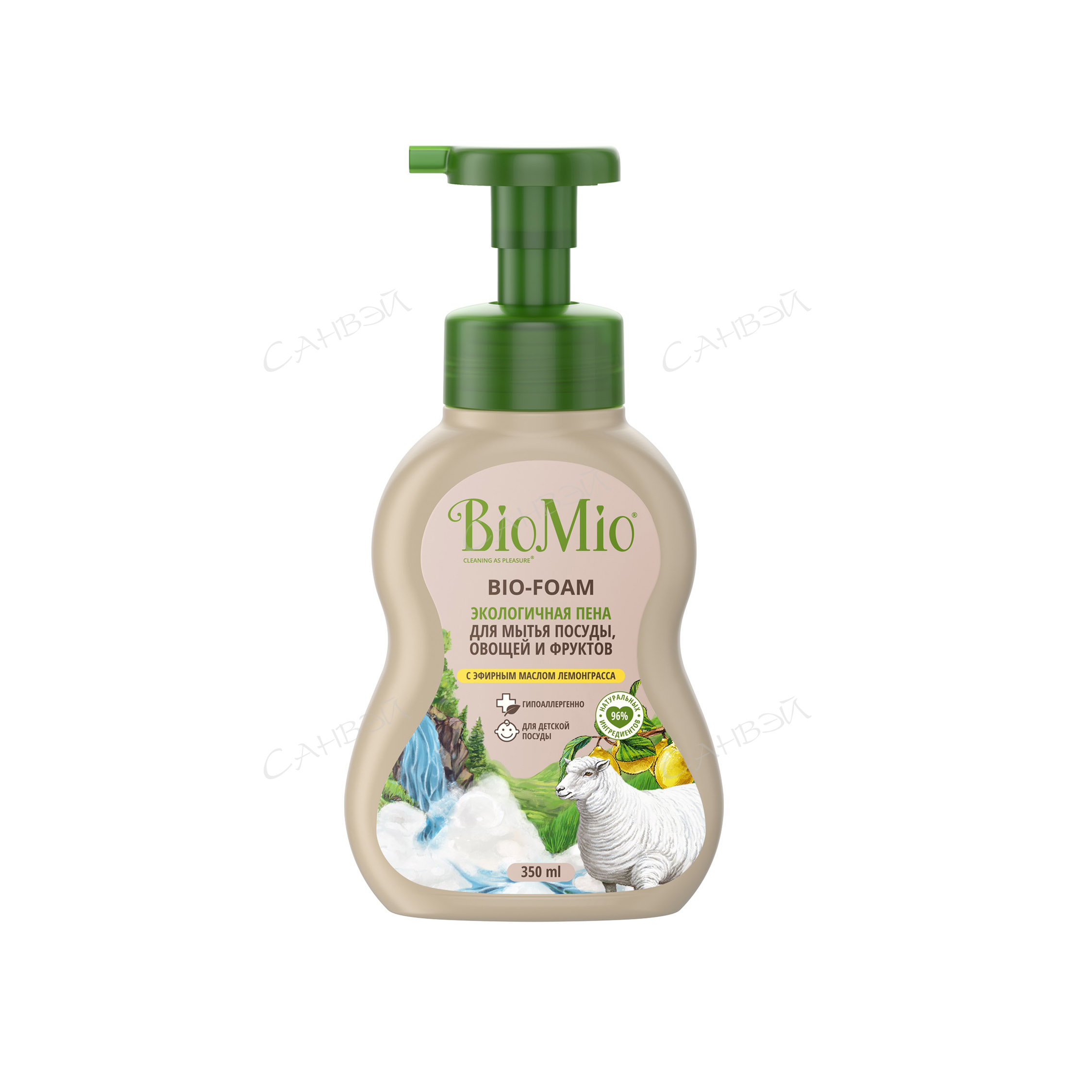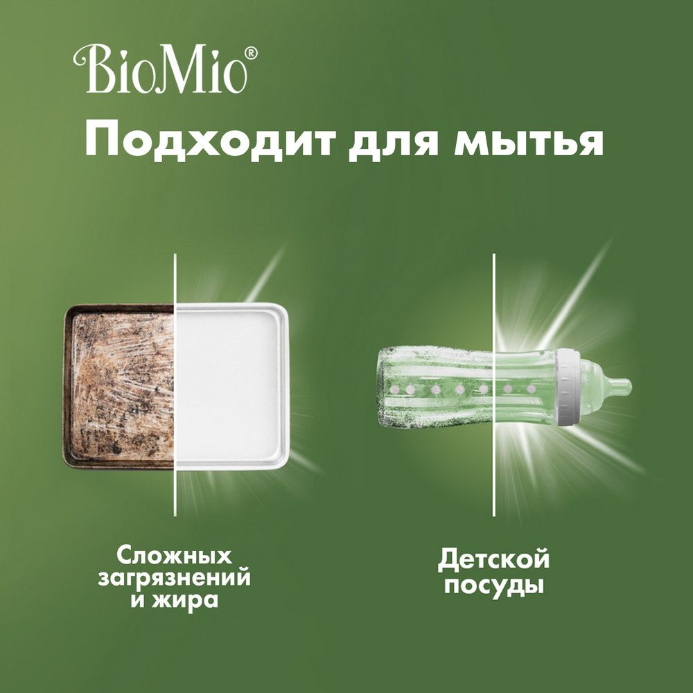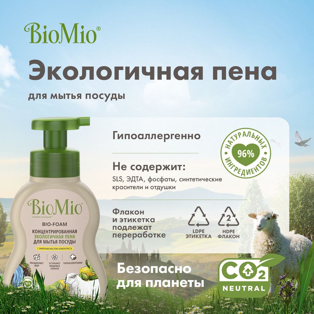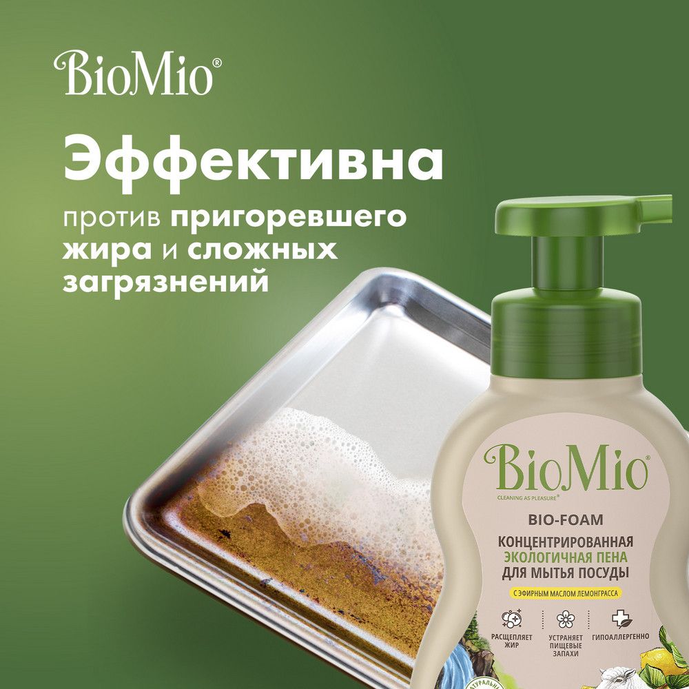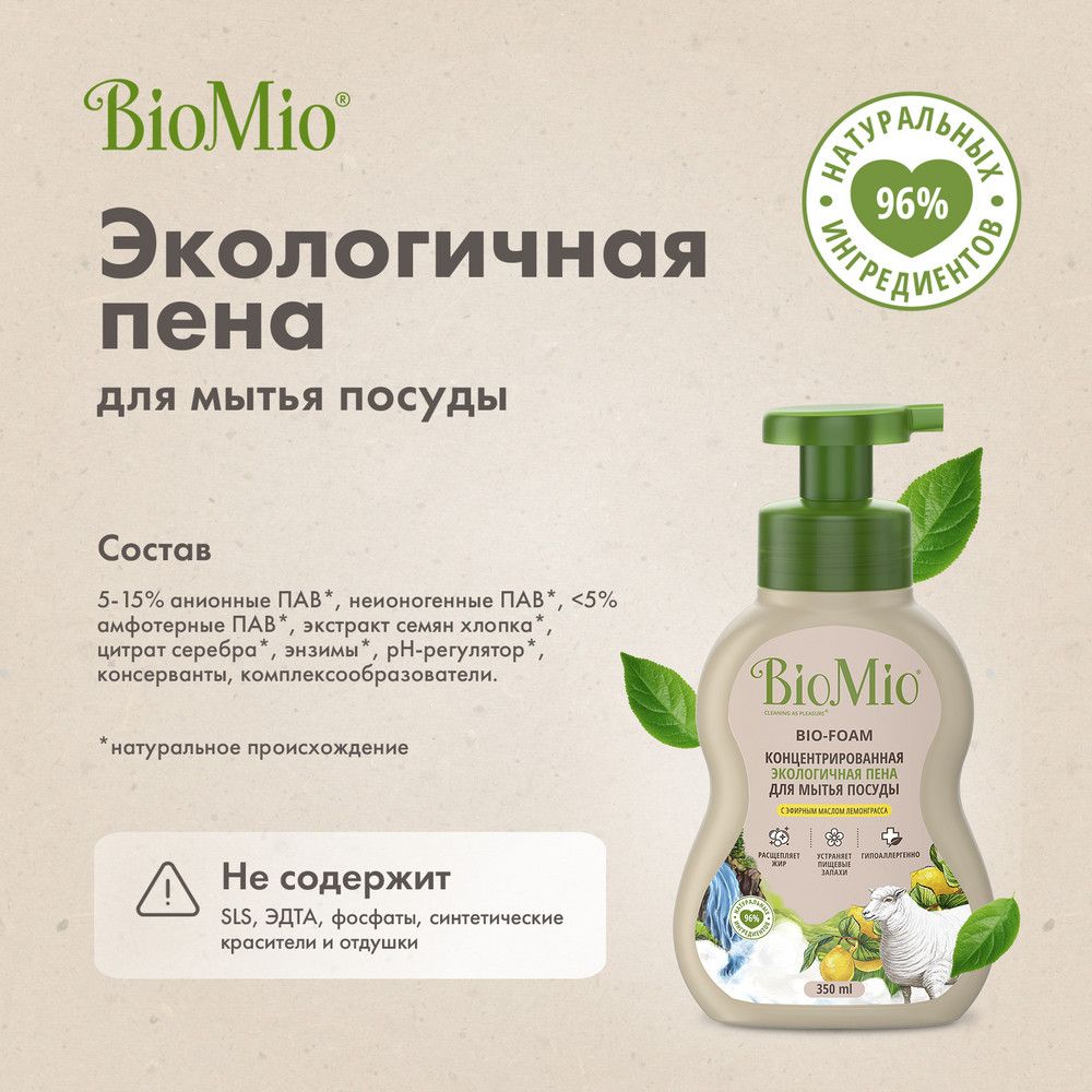 BioMio Экологичная концентрированная пена для мытья посуды (в том числе детской) с экстрактом хлопка. С эфирным маслом лемонграсса, 350 мл из интернет-магазина Санвэй легко расщепляет пригоревший жир и удаляет стойкий запах пищи.