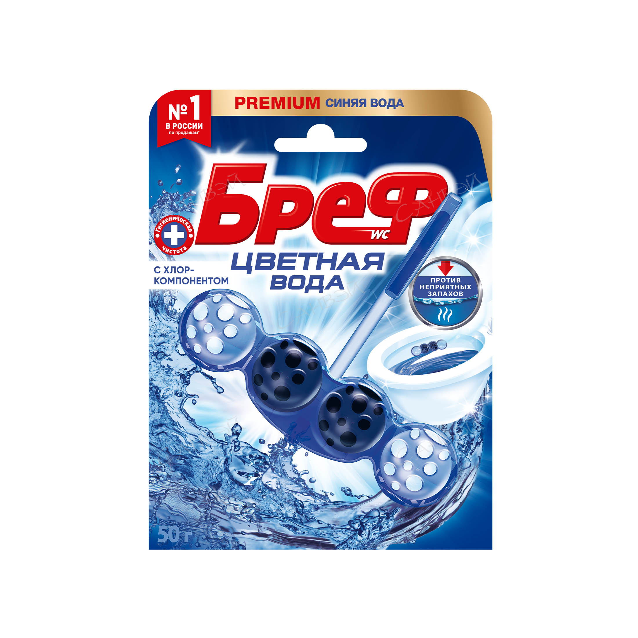 Бреф Цветная Вода с хлор-компонентом 50 гр в магазине Санвэй - подвесной туалетный блок с технологией нейтрализации запахов, которая создает защитный барьер на пути неприятных запахов. Активная формула цветной воды действует в 4 направлениях:
