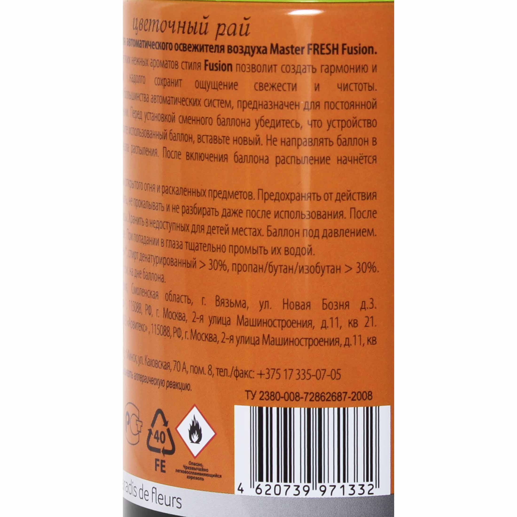 Освежитель воздуха (сменный баллон) Master FRESH подходит для большинства автоматических систем. Легкий, нежный аромат надолго сохранит ощущение свежести и чистоты в Вашем доме. Создает атмосферу свежести, чистоты и уюта, наполняя дом приятным ненавязчивым ароматом. Заменяет свечи, арома-лампы, саше, диффузоры. Для ванной комнаты и туалета – более современный аналог освежителя воздуха. Для гостиной, детской или спальни – освежает и увлажняет воздух, создает комфортный уровень ароматизации помещения. Для кухни – нейтрализует запахи жарки, некоторых продуктов (лук, чеснок, рыба). Высокая концентрация и активная формула — баллон действует до 60 дней.