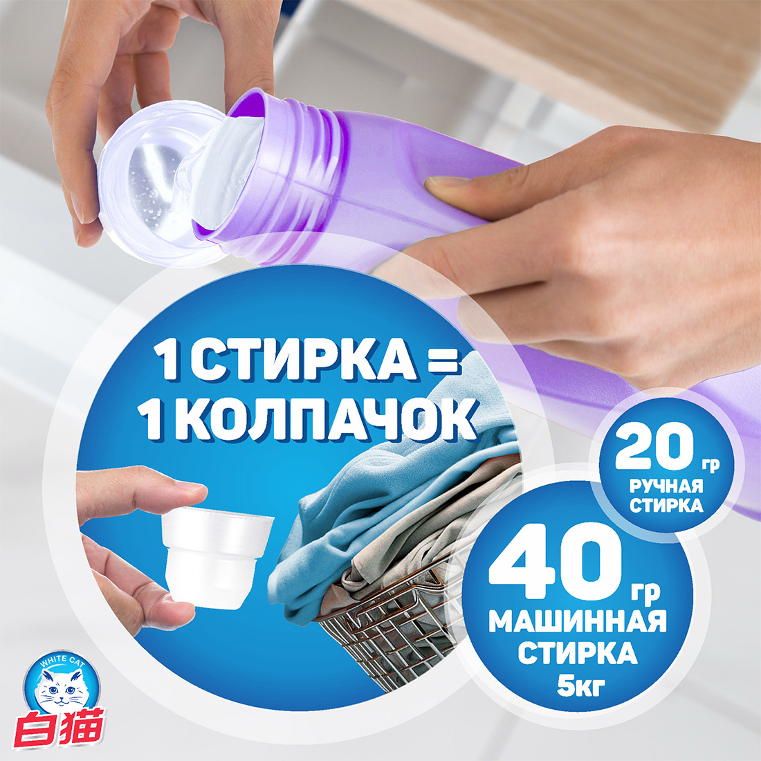 Для интенсивной стирки 8-10 вещей необходимо 40 г средства. Для ручной стирки 4-6 вещей подойдет 20 г средства. Крышка геля содержит мерные деления.