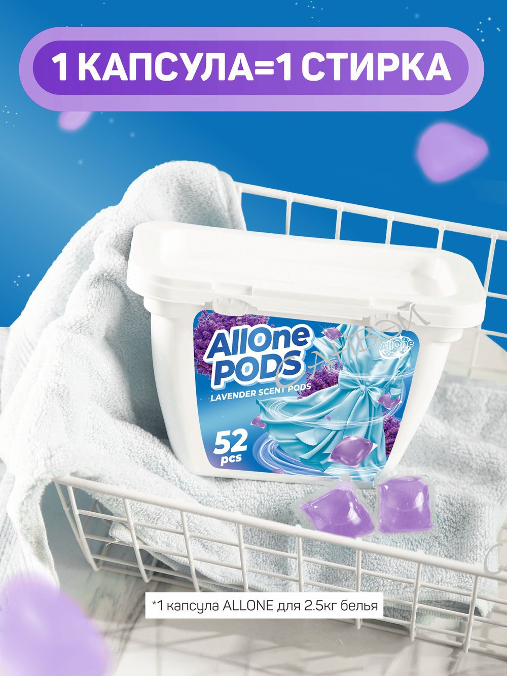 Парфюмированные капсулы для стирки Allone 52 шт Лаванда - это удобное и эффективное средство для получения идеальной чистоты и свежести вашего белья. Каждая капсула содержит комплекс мощных активных ингредиентов, одной капсулы хватает на одну стирку. Капсулы отлично справляются с самыми сильными загрязнениями, не оставляют разводов, а также устраняют неприятные запахи. Обладают антибактериальным действием, быстро растворяются в воде. Парфюмированные капсулы Allone обладают приятным ароматом лаванды, который будет радовать вас после каждой стирки. Простота использования: не нужно отмерять и наливать, просто добавьте капсулу в барабан стиральной машины до загрузки белья. Подходит для стирки всех типов ткани, кроме шёлка и шерсти.