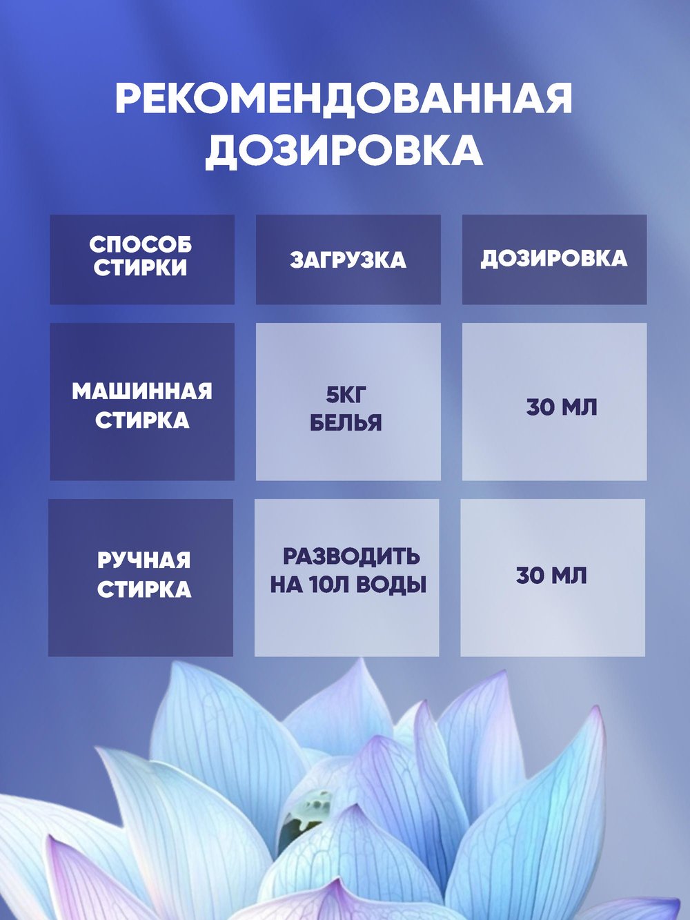 Для машинной и ручной стирки. Для всех типов тканей. Смягчает, разглаживает складки, снимает статическое напряжение.