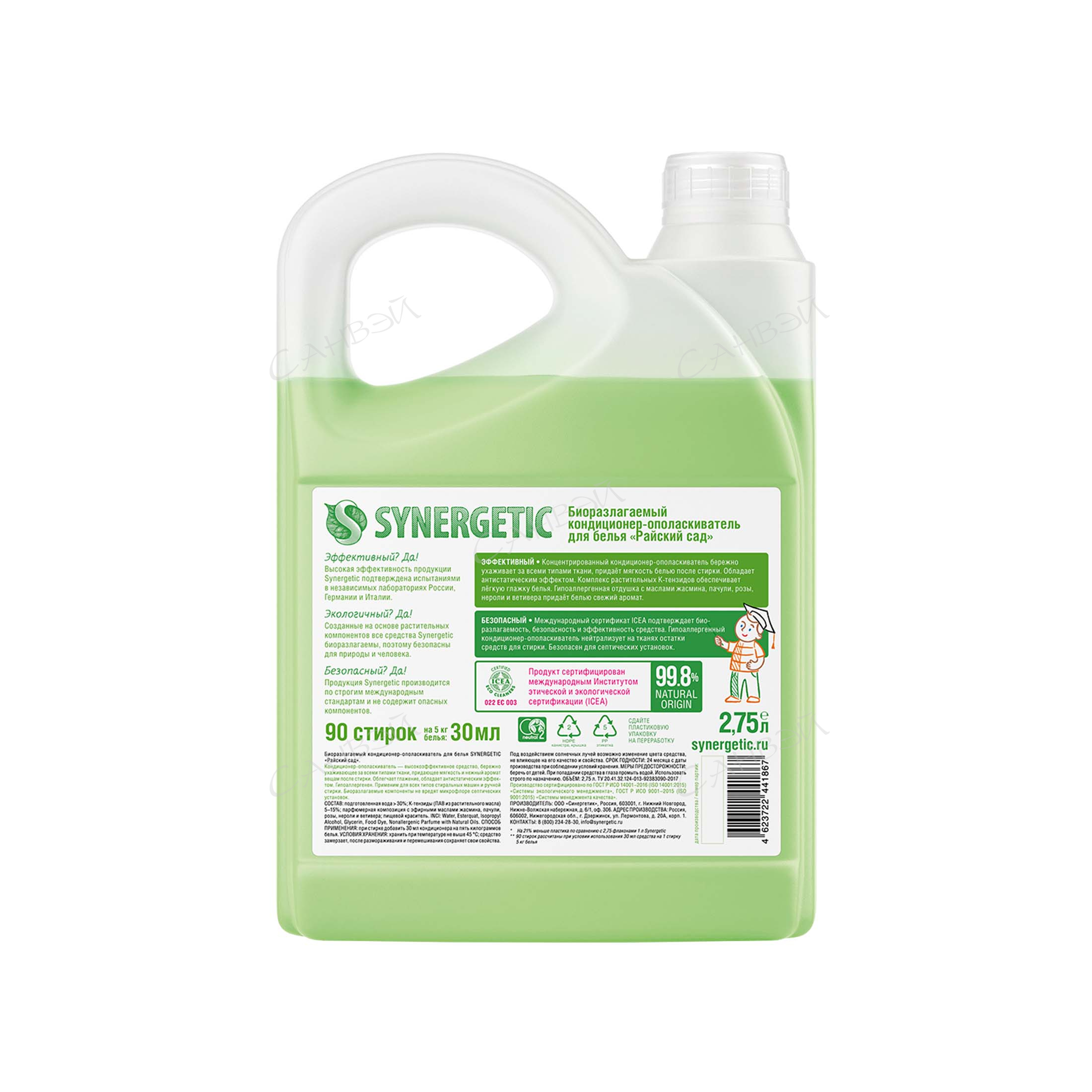Кондиционер-ополаскиватель для белья «Райский сад» объёмом 5 литров – экономичная упаковка с запахом воспоминаний о солнечном лете и легким ароматом фруктового сада. Подарит мягкость вашим вещам. В одном средстве слились приятный натуральный аромат, насыщенная текстура суперконцентрата и привлекательный салатовый оттенок. С экологичным ополаскивателем одежда станет не только мягкой и приятной к телу, но и приобретет легкий фруктовый аромат. Кондиционер для белья не остается на одежде, облегчает глажение и обладает антистатическим эффектом. Создан на основе растительных компонентов с добавлением натуральных масел. Покупать средства SYNERGETIC в большой упаковке выгоднее и удобнее в хозяйстве! Это запас на 165 стирок.