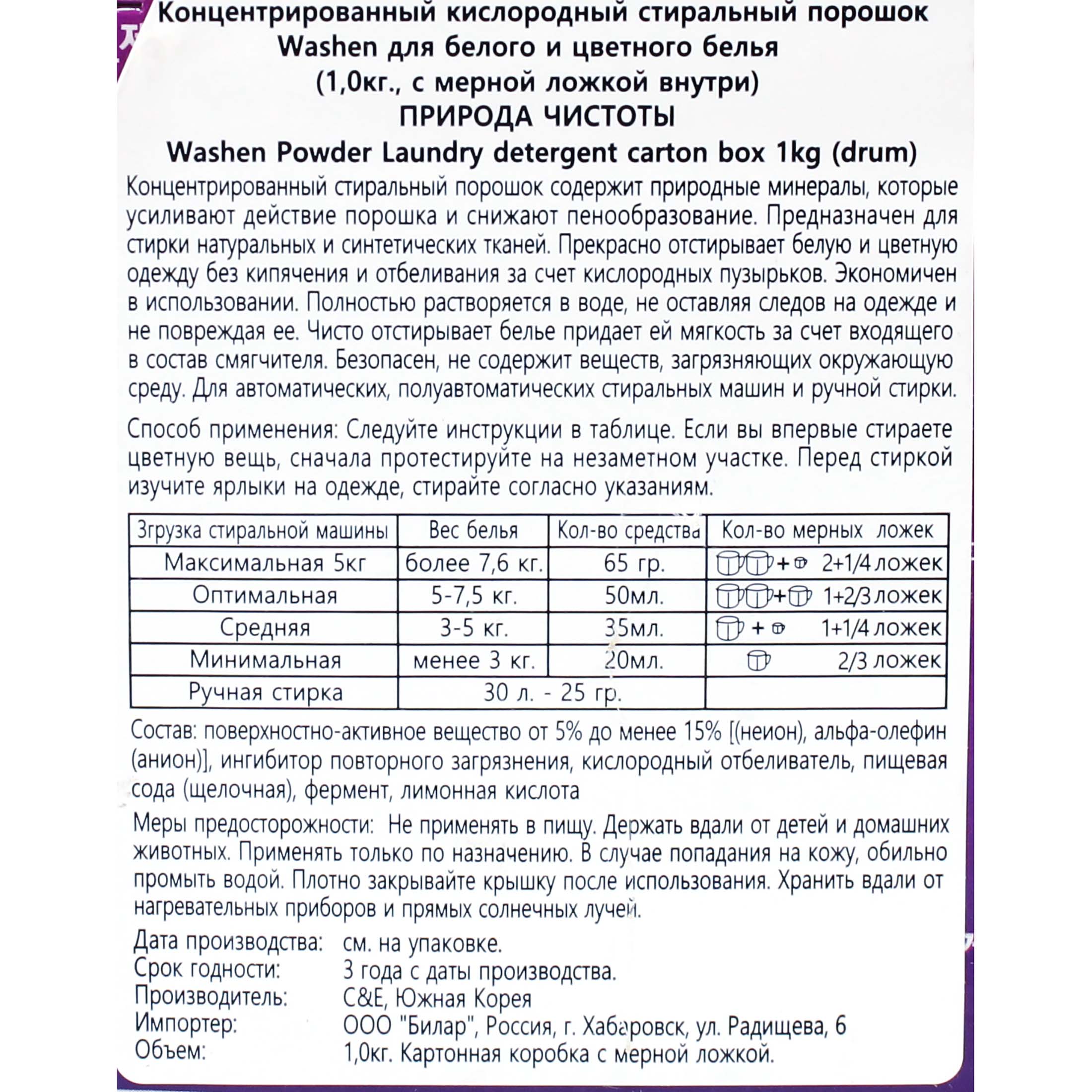 Концентрированный стиральный порошок Washen предназначен для стирки натуральных и синтетических тканей. Прекрасно отстирывает белую и цветную одежду без кипячения и отбеливания за счет кислородных пузырьков. Экономичен в использовании. Полностью растворяется в воде, не оставляя следов на одежде и не повреждая её. Чисто отстирывает одежду, придаёт ей мягкость за счет входящего в состав смягчителя. Подходит для всех типов стиральных машин и ручной стирки.