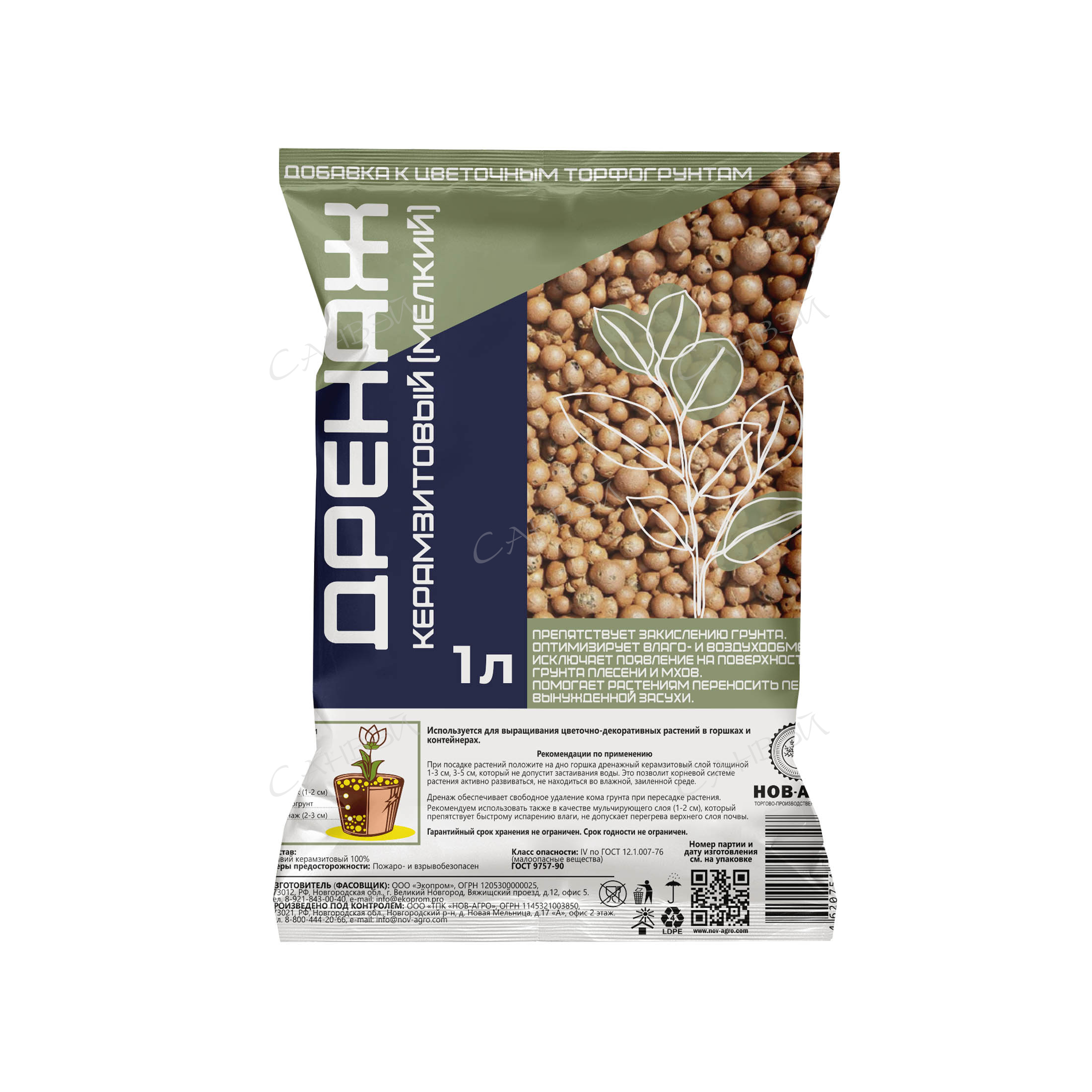 Нов-Агро Керамзитный дренаж (мелкая фракция 5-10мм) 1л - обожженная глина с пористой структурой. Оптимизируется воздухообмен. Улучшает воздухообмен. Кроме того, керамзитовый дренаж препятствует закислению грунта, исключая появление на его поверхности плесени и мхов.
