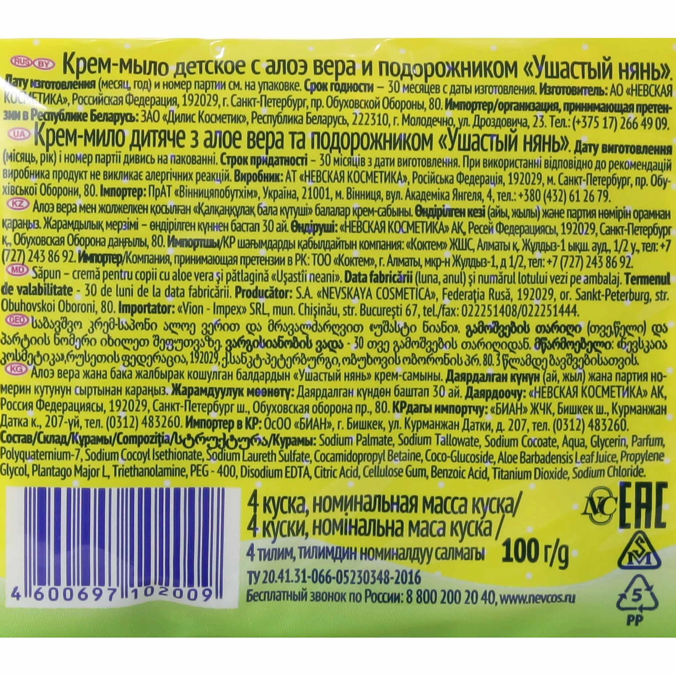 Детское крем-мыло Ушастый Нянь 4 x 100 г с алоэ вера и подорожником мягчает, питает и бережно очищает кожу малышей.