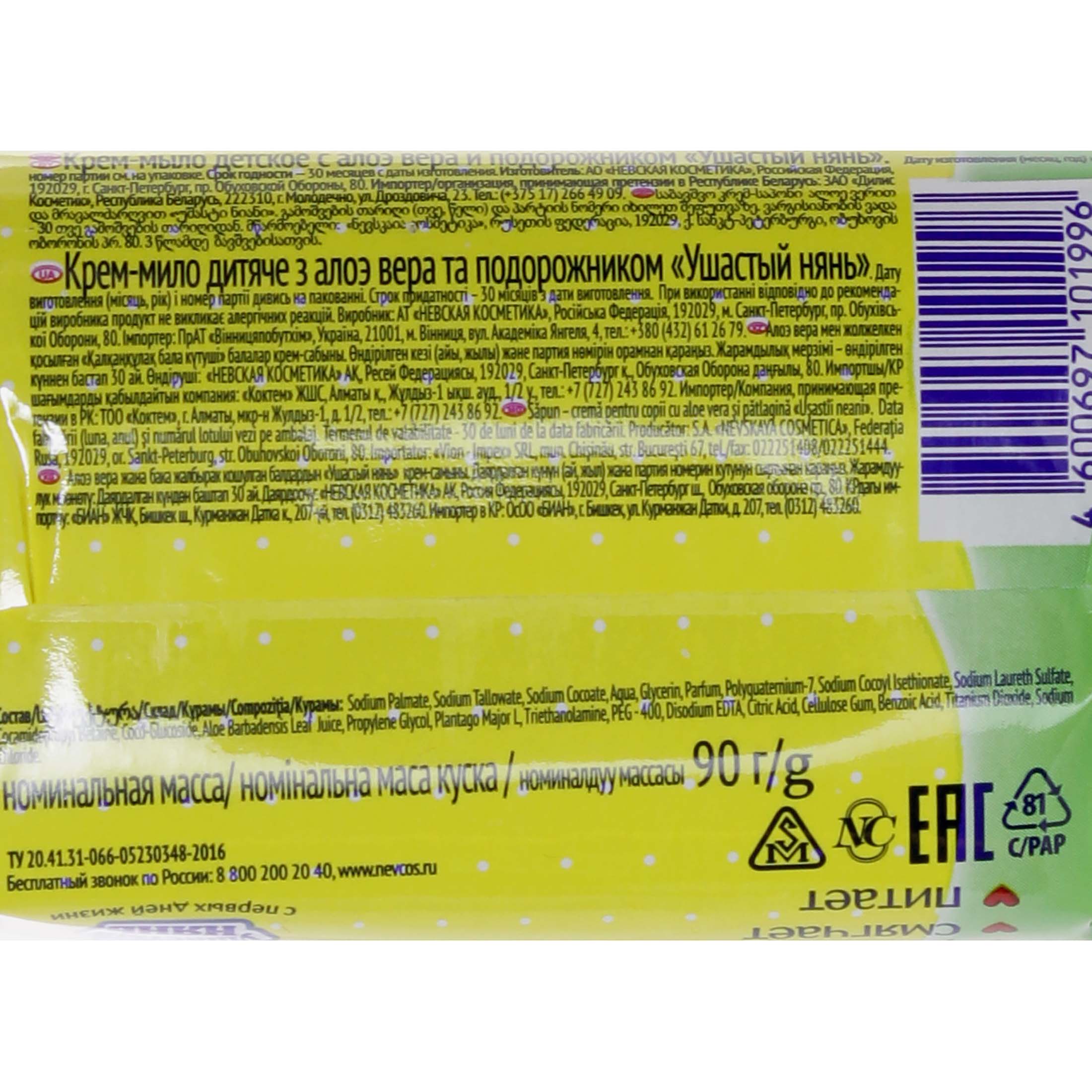 Детское крем-мыло Ушастый Нянь 90 г с алоэ вера и подорожником мягчает, питает и бережно очищает кожу малышей.