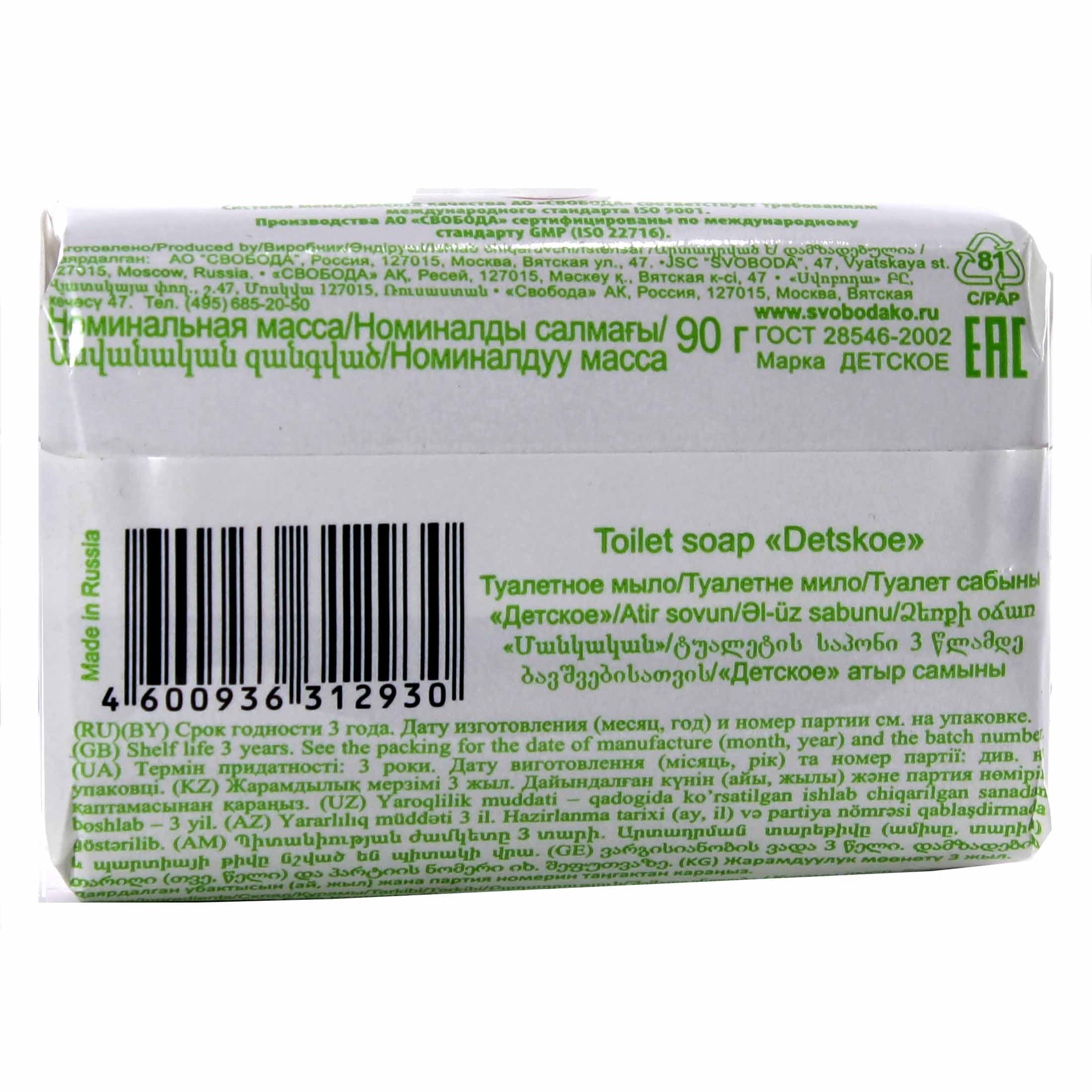 Детское мыло Свобода с экстрактом зверобоя вырабатывается из высококачественного жирового сырья и растительных масел. Натуральный глицерин и масляный экстракт зверобоя, входящие в состав туалетного мыла, способствуют смягчению кожи и сохранению её увлажненности. Туалетное мыло «Детское» обладает высокой моющей и пенообразующей способностью, прекрасно очищает кожу и улучшает её гигиеническое состояние. Туалетное мыло «Детское» предназначено для нежной и чувствительной кожи детей и взрослых.