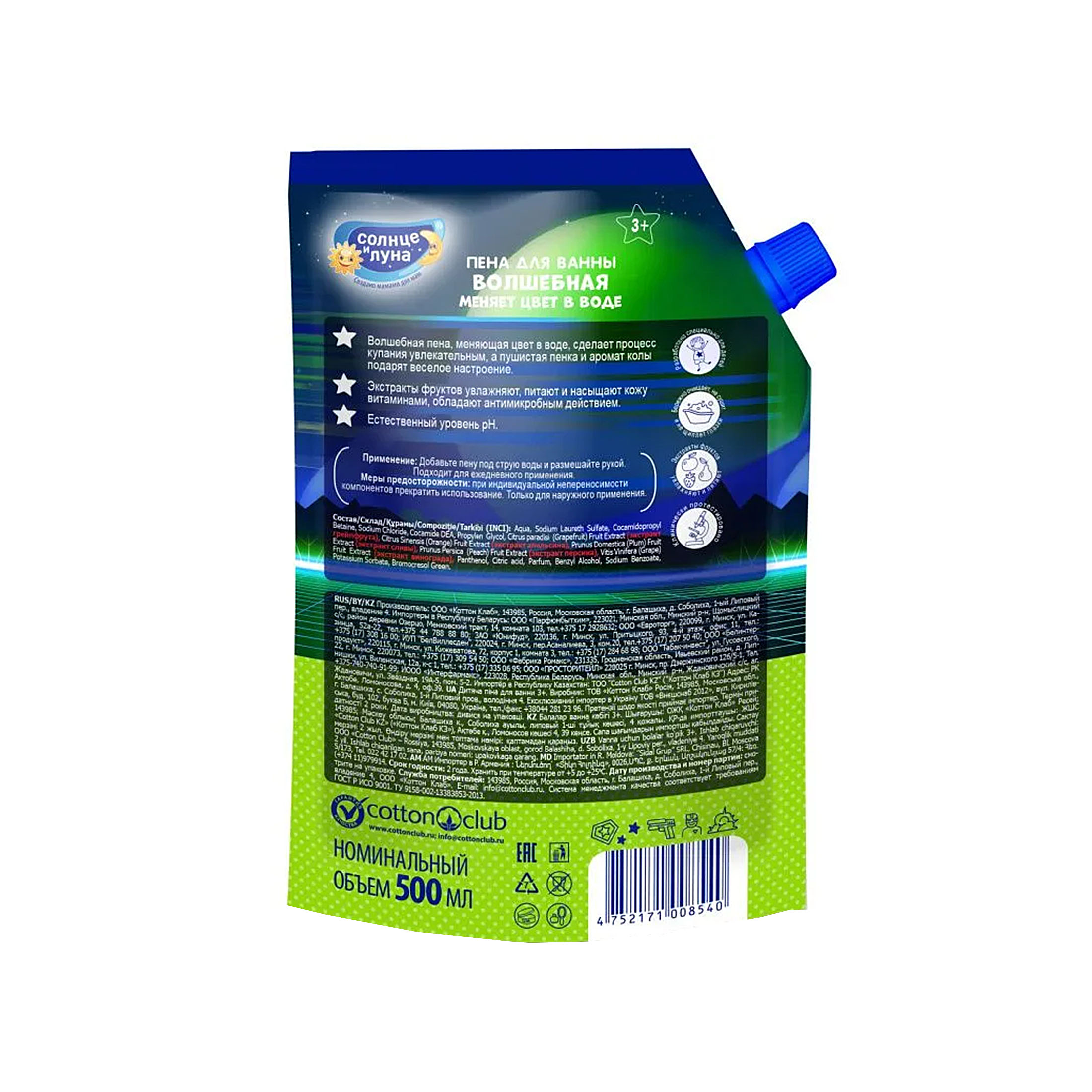 С волшебной пеной для ванны водные процедуры вашего ребенка станут еще увлекательнее и интереснее! Пушистая пена мягко очищает нежную кожу, экстракты фруктов увлажняют и питают ее, обладают антимикробным действием. Естественный ph. Клинически протестировано. Не сушит кожу и не щиплет глазки. Разработано специально для детей. Купание в большом количестве пены и в воде синего цвета позабавят вашего ребенка, а вкусный аромат колы подарит веселое настроение.