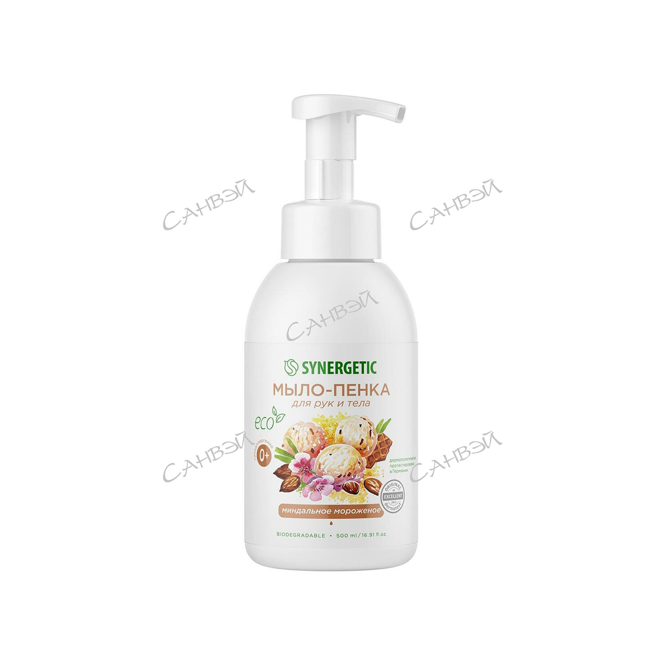 Мягкое жидкое мыло-пенка для рук и тела SYNERGETIC Миндальное мороженое на основе натуральных компонентов из магазина Санвэй бережно очищает кожу и оставляет приятный аромат миндального мороженого.