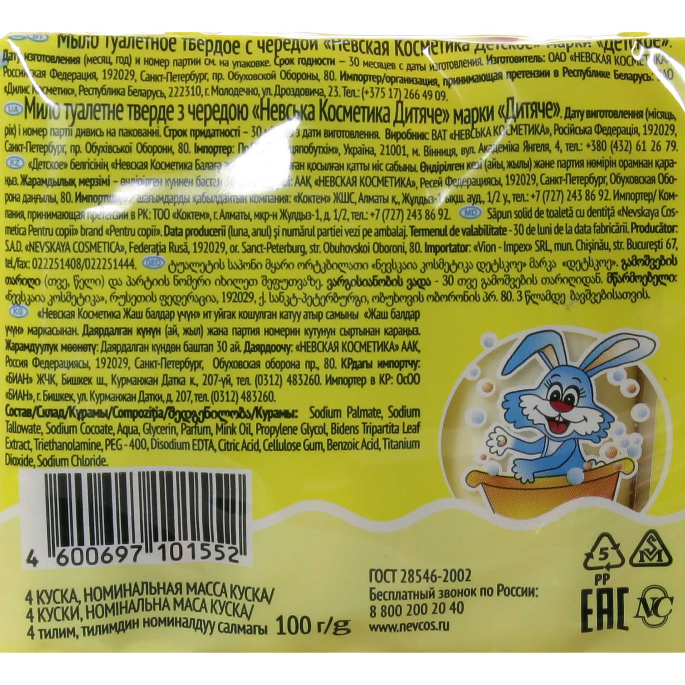Туалетное мыло Детское с чередой российского производителя «Невская Косметика» содержит высококачественные натуральные ингредиенты. Оно бережно очищает и не сушит кожу, обладает антимикробным и успокаивающим действием, увлажняет и питает. Средство рекомендуется использовать для гигиены детей и взрослых при повышенной чувствительности кожи. Без отдушек и красителей, с естественным легким ароматом. Выгодная упаковка!