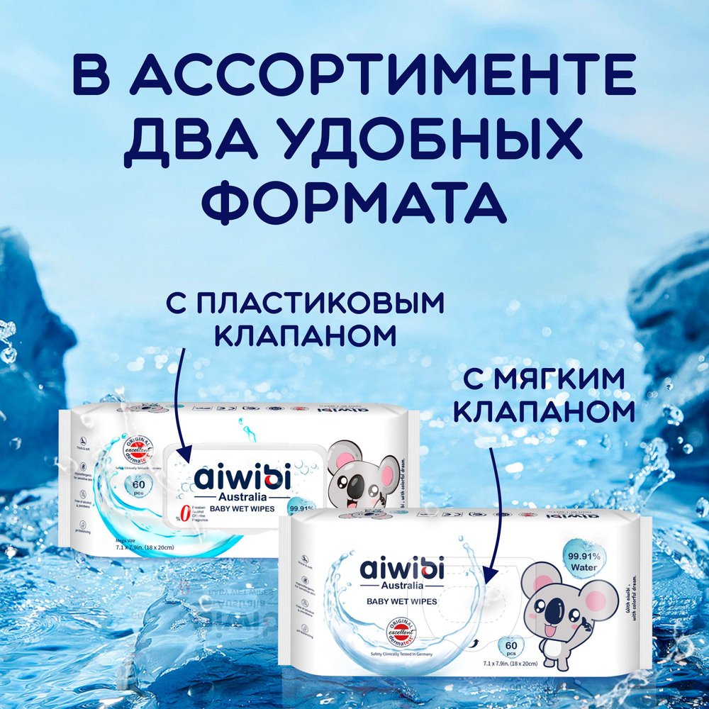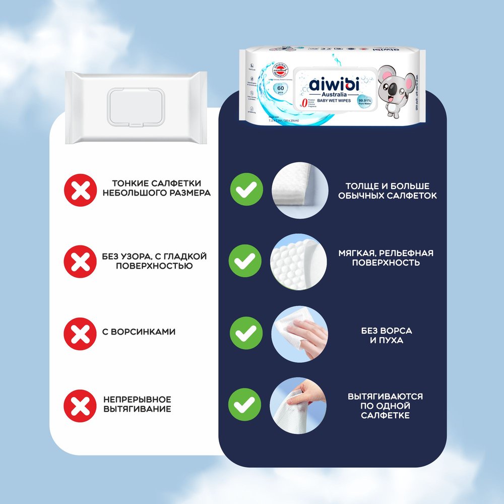 Детские влажные салфетки AIWIBI (60шт) детс. очищ. д/чув.кожи 0+ созданы специально для ежедневного тщательного ухода за нежной кожей малыша.