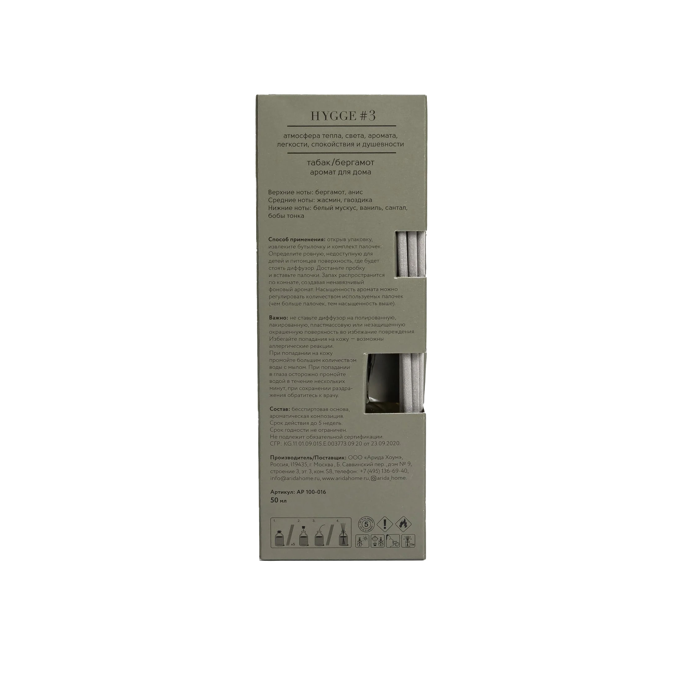 Arida Home Аромадиффузор с палочками Hugge №3 Табак, Бергамот 50 мл из интернет-магазина Санвэй — это безопасный, экологически чистый и натуральный способ ароматизации помещения, является прекрасной альтернативой ароматизированным спреям. Диффузор представляет собою изящную стеклянную емкость с ароматной жидкостью. В нее вставляются несколько длинных фибровых палочек. Постепенно, насыщаясь эфирными маслами, они распространяют аромат по всей комнате.