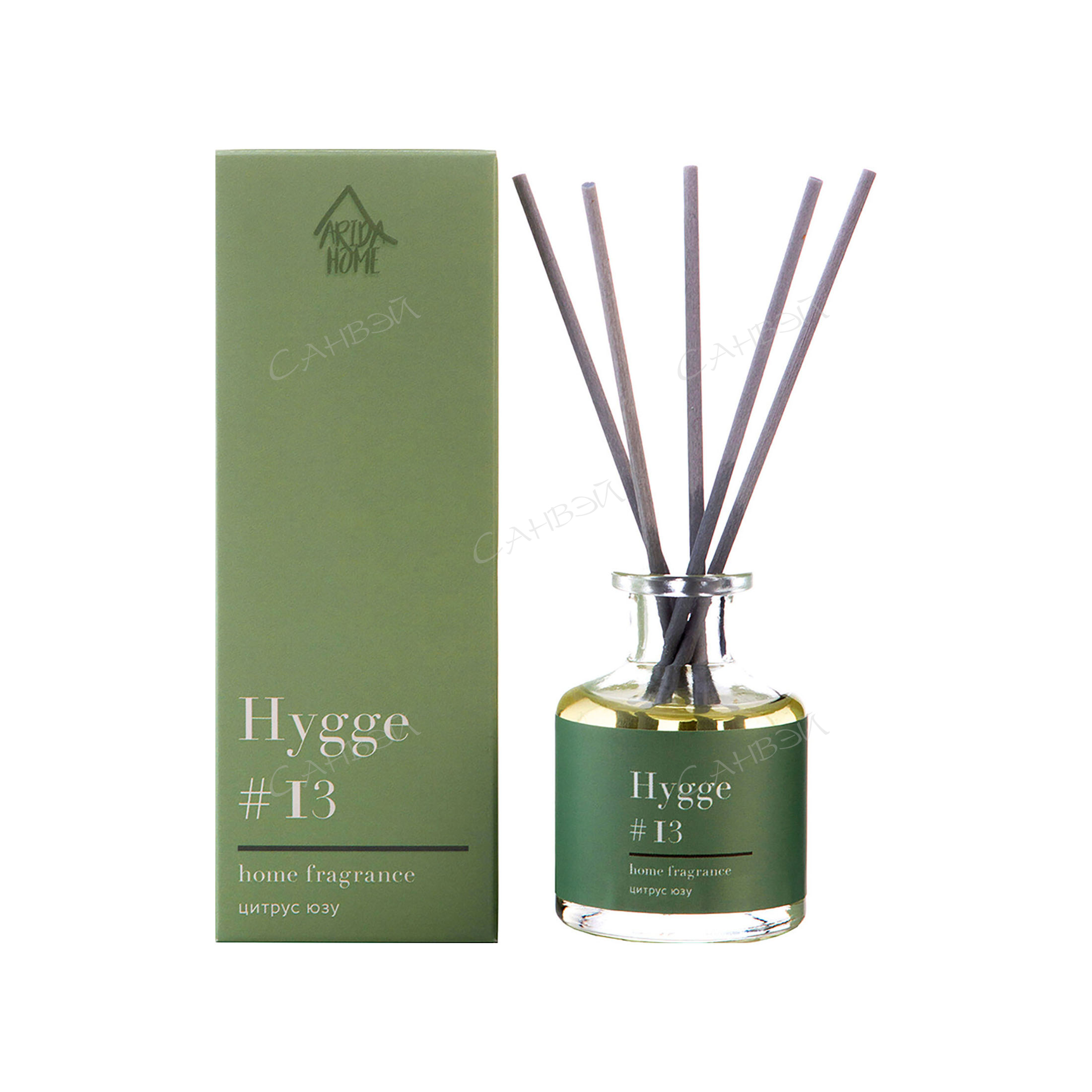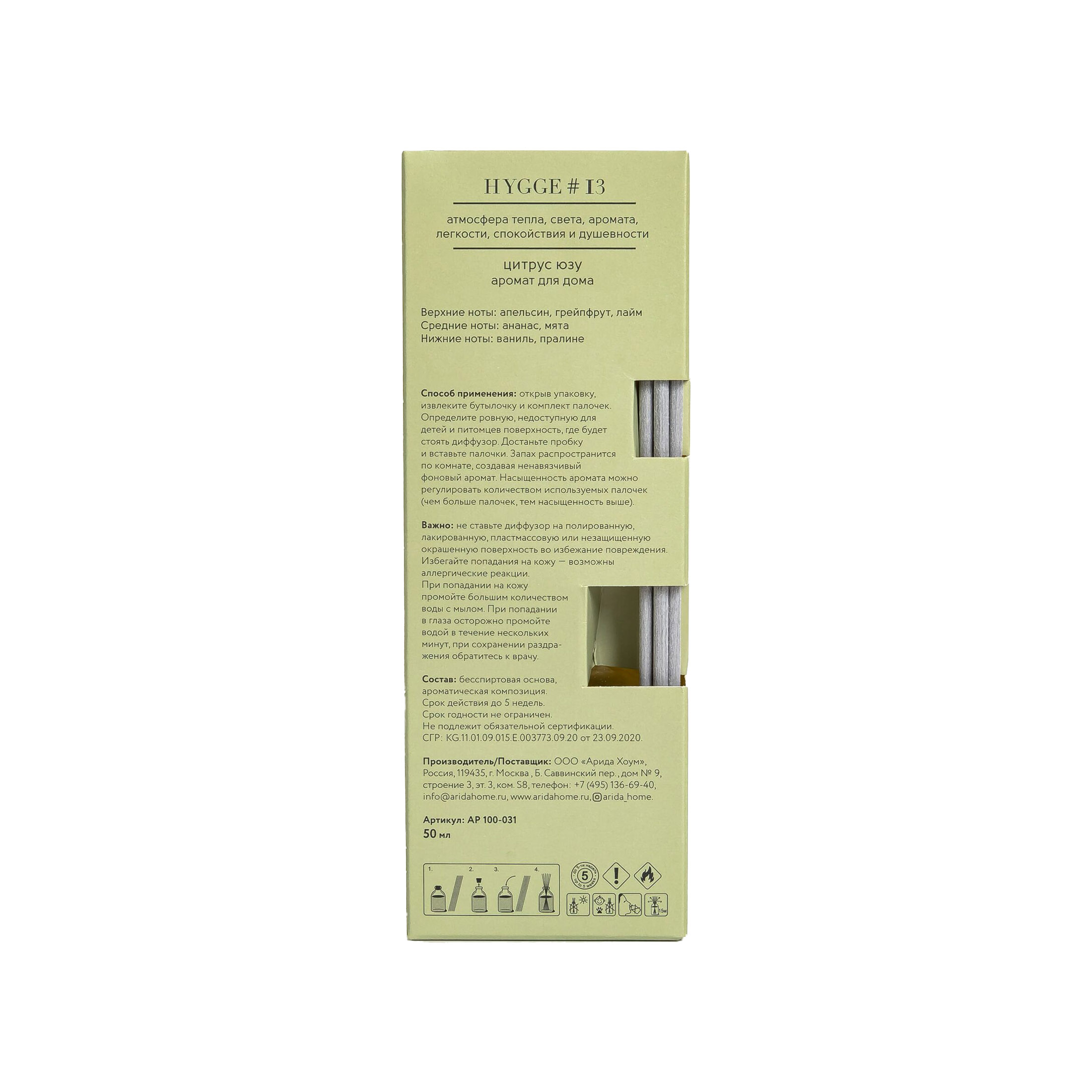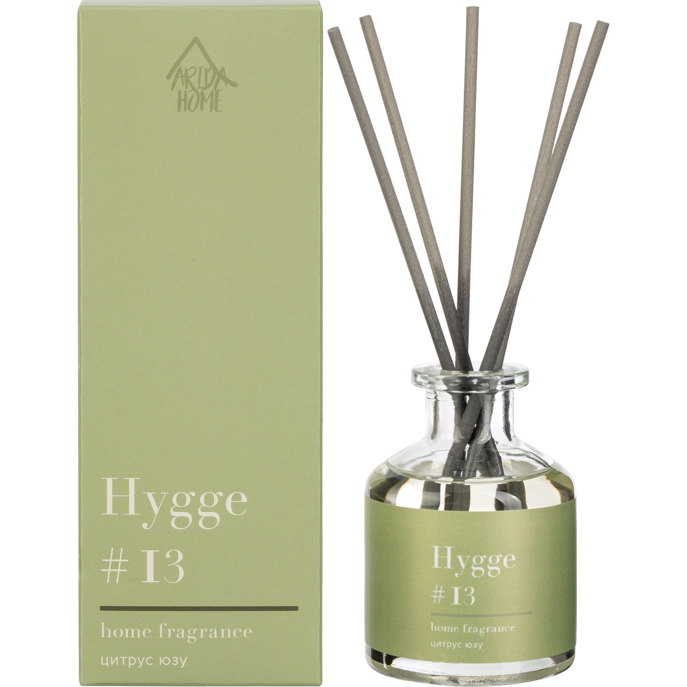 Arida Home Аромадиффузор с палочками Hygge 13 Цитрус юзу 50 мл из интернет-магазина Санвэй — это безопасный, экологически чистый и натуральный способ ароматизации помещения, является прекрасной альтернативой ароматизированным спреям. Диффузор представляет собою изящную стеклянную емкость с ароматной жидкостью. В нее вставляются несколько длинных фибровых палочек. Постепенно, насыщаясь эфирными маслами, они распространяют аромат по всей комнате.