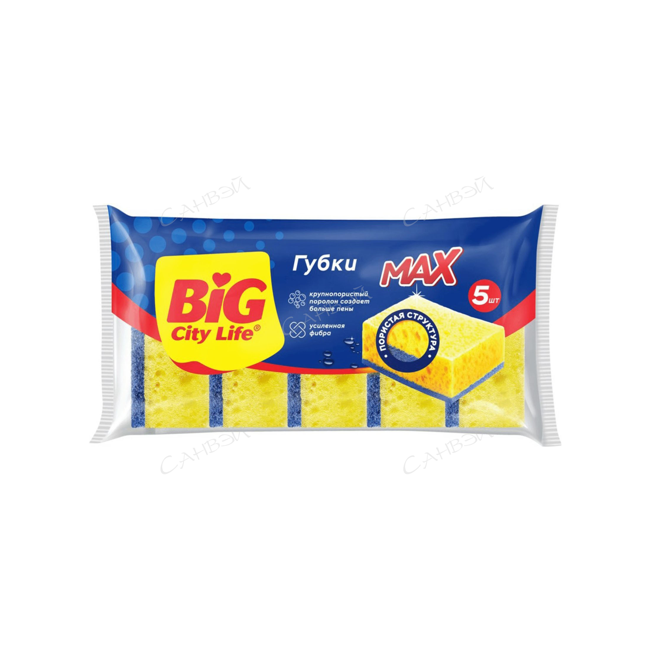Big City Life Губки для мытья посуды Max крупнопористые 5 шт изготовлены из крупнопористого поролона. Особая структура упругой губки и увеличенных пор способна образовывать большое количество пены даже с небольшим количеством моющего средства. Губки приятные на ощупь и более эффективные в очистке посуды по сравнению с губками меньшего размера и без пор. Упругий поролон не крошится при высыхании, устойчив при длительном контакте с водой. Усиленная износостойкая фибра надежно приклеена к поролоновому слою и помогает легко очистить сложные загрязнения. Во избежание размножения бактерий кухонную губку рекомендуется менять каждую неделю.