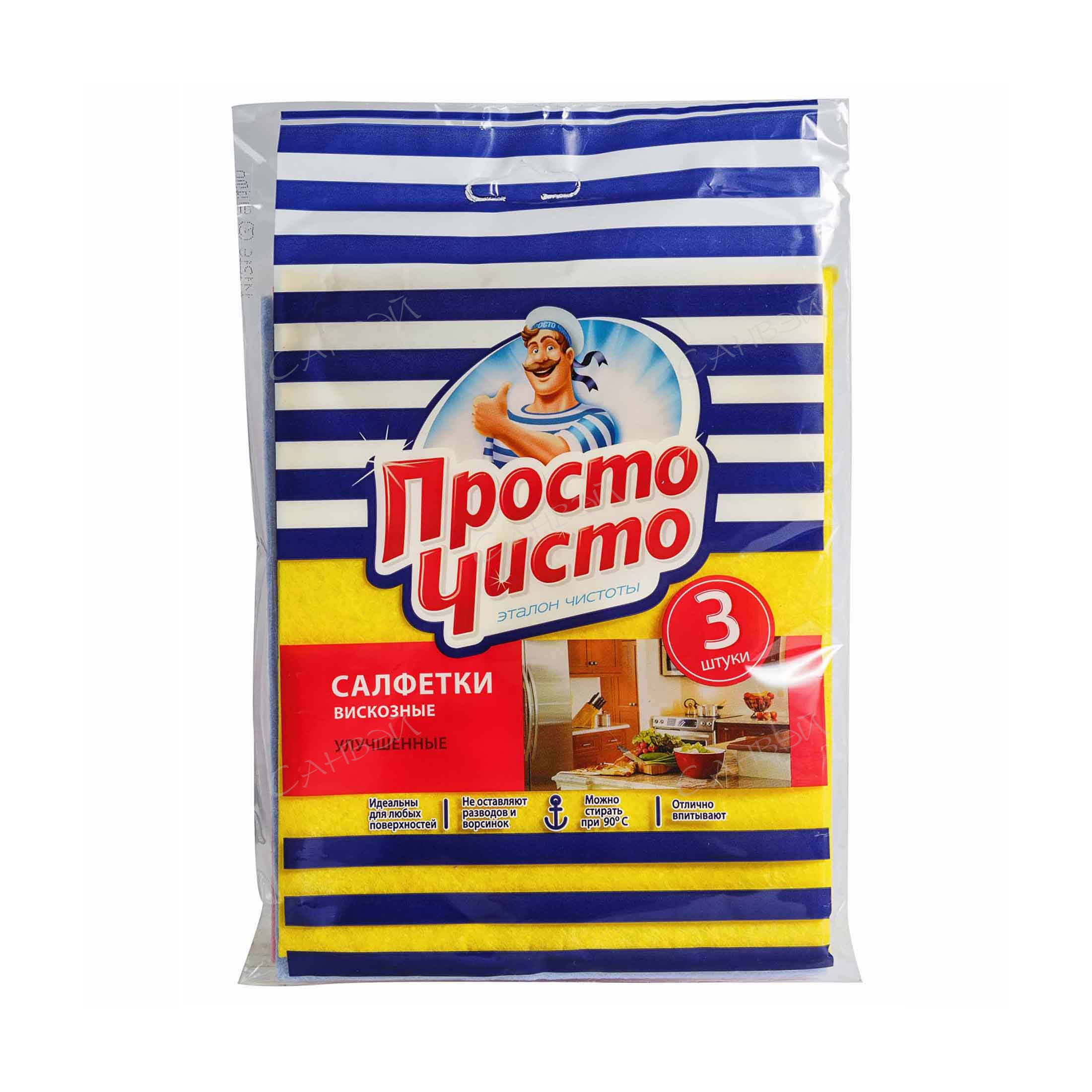 Просто Чисто Салфетки визкозные Улучшенные 3 шт предназначены для всех видов уборки. Удобны при оттирании окон, зеркал, кафеля, сантехники, мебели, и бытовой техники. Обладает антистатическим эффектом, идеальна для больших поверхностей, а также не оставляет разводов и ворсинок. Очищает без применения чистящих и моющих средств. Отлично впитывает.