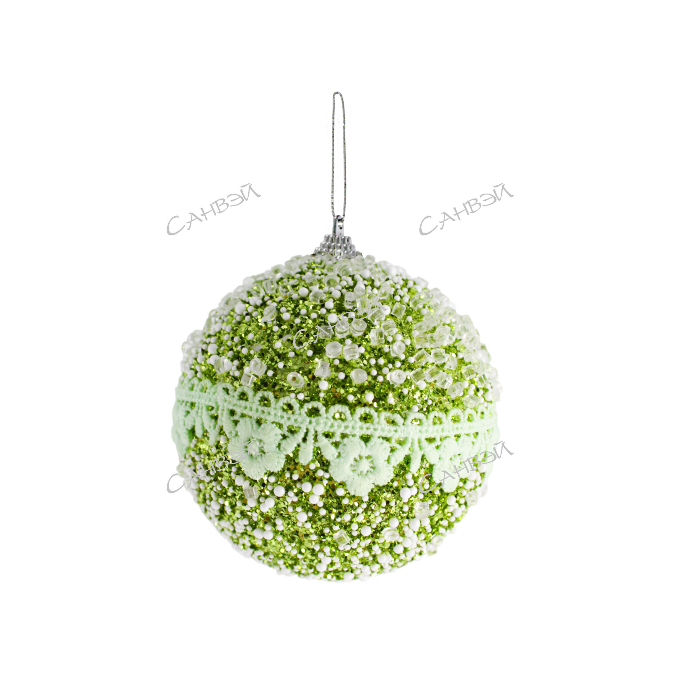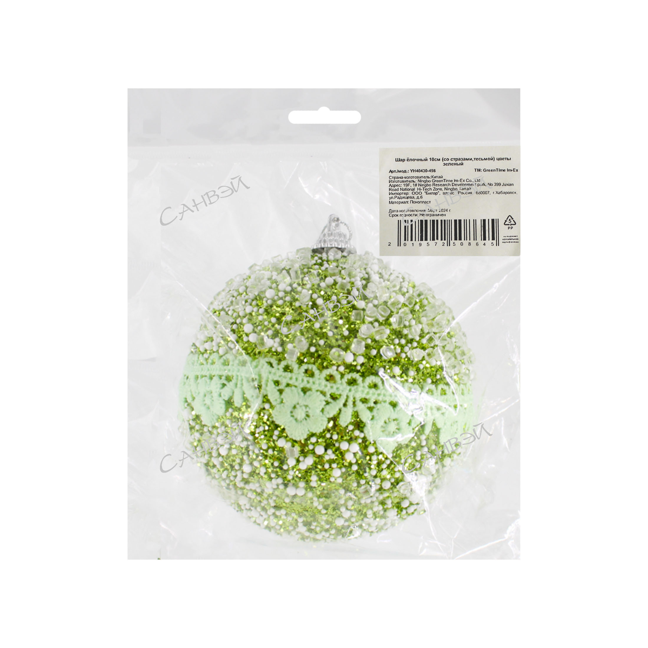 MU Шар ёлочный 10см (со стразами,тесьмой) цветы зеленый пенопласт GT 1шт / 144шт / YH40430-498 / 508652