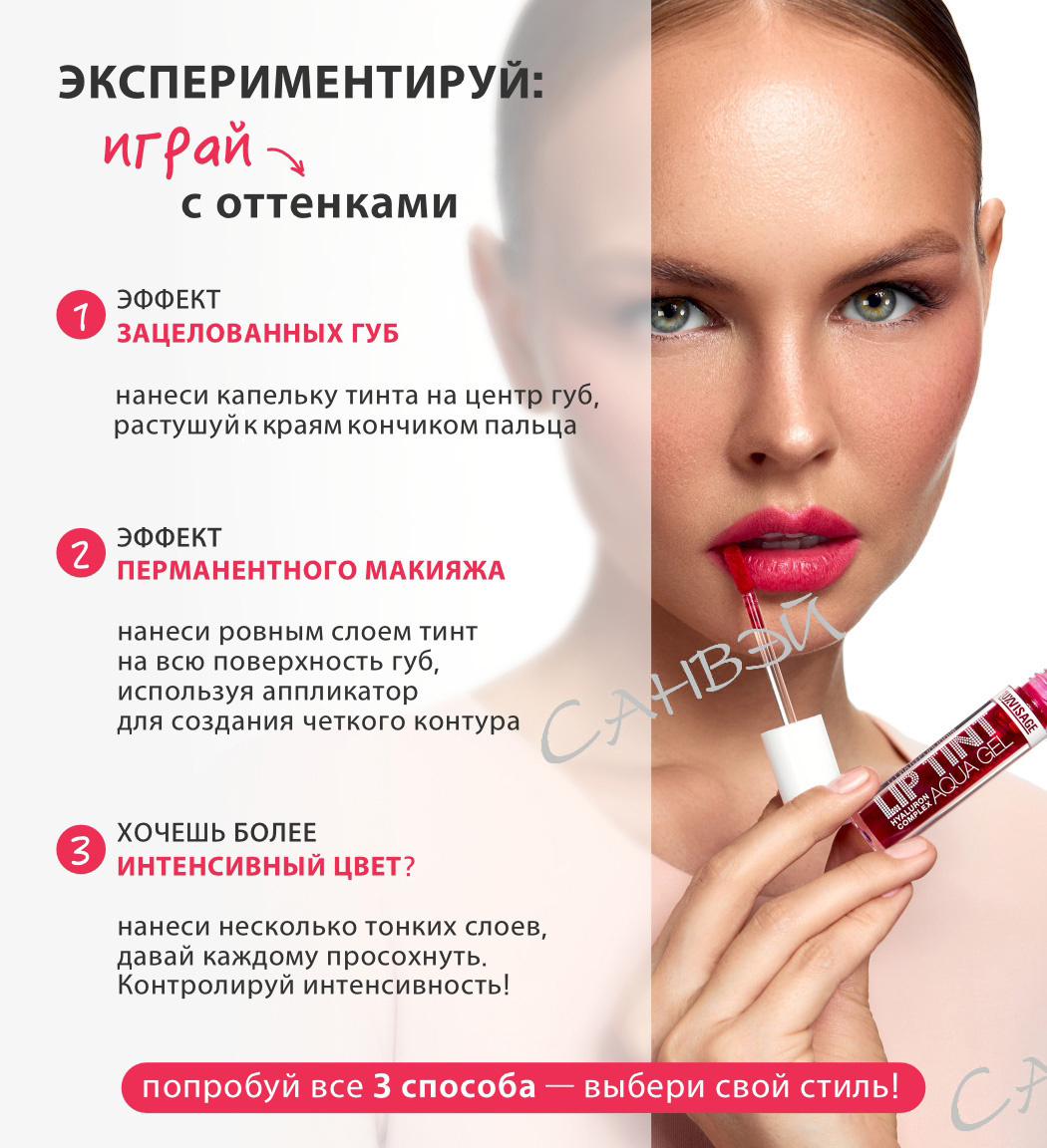 - Для естественного эффекта точечно нанесите несколько капель тинта на губы с помощью аппликатора и незамедлительно растушуйте подушечками пальцев вбивающими движениями либо небольшой кистью. Наслаивайте для получения более глубокого и насыщенного оттенка, обязательно давая покрытию высохнуть между слоями.