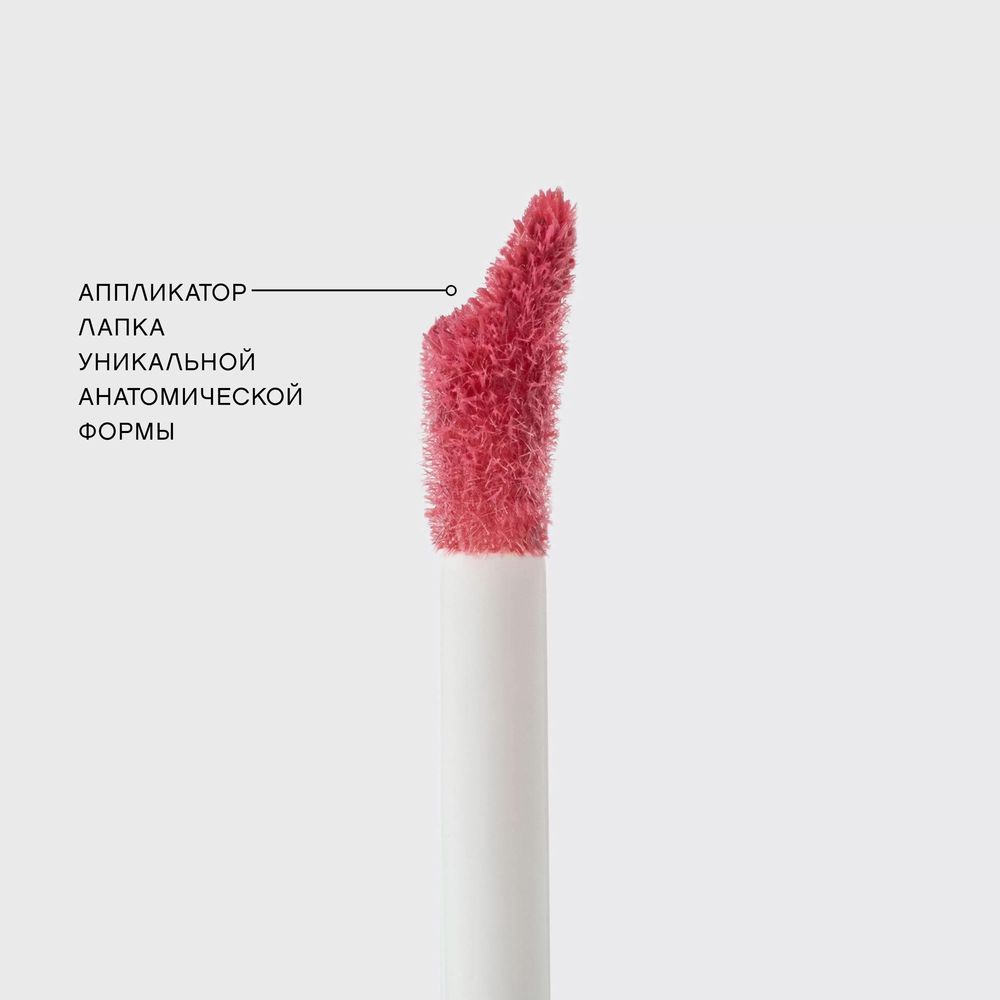 - Тинт упакован в элегантный флакон с деталью в виде помпона на крышке. Его пушистый аппликатор-лапка уникальной анатомической формы равномерно наносит продукт на всю поверхность губ и аккуратно подчеркивает контур.