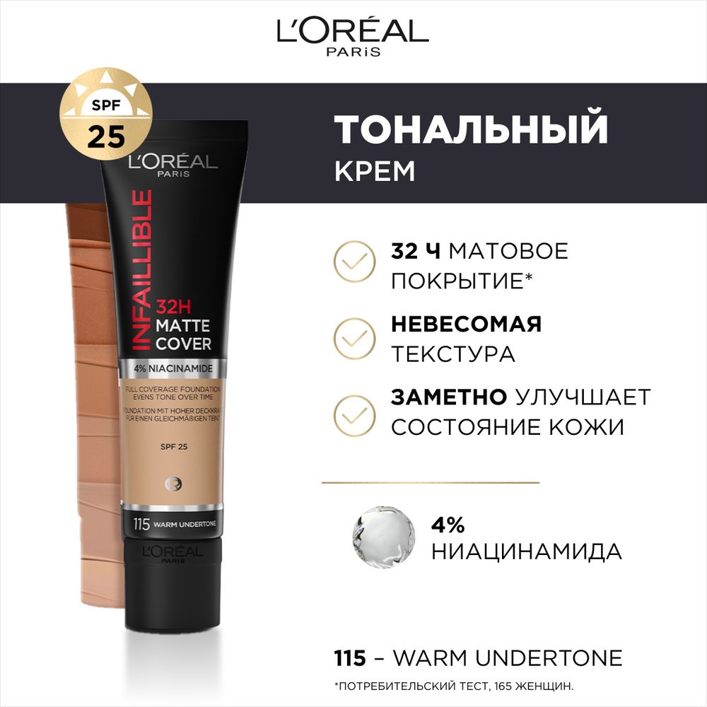 - Стойкий тональный крем Infaillible 32ч держится в течение всего дня, ощущается ультралегким и дышащим на коже. Формула с 4% ниацинамида в составе выравнивает тон кожи и маскирует все виды кожных несовершенств. Невесомая текстура матирующего тонального крема легко наносится и равномерно распределяется на коже.