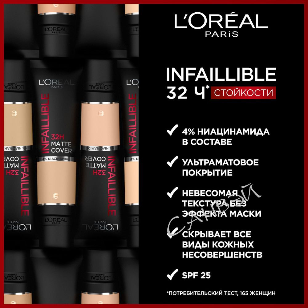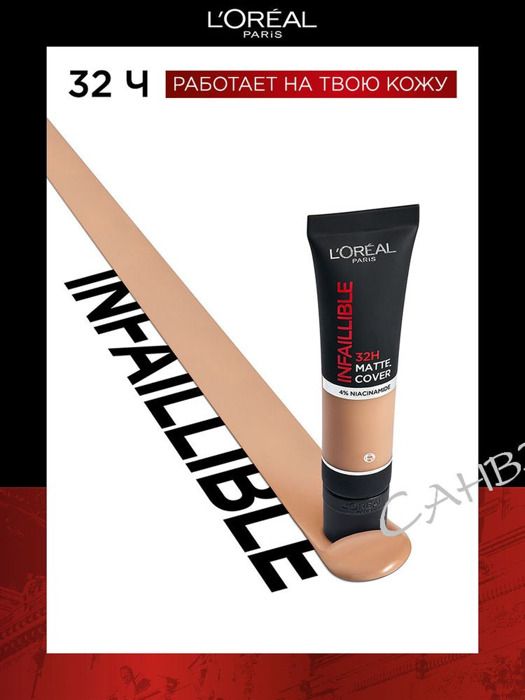 - Стойкий тональный крем Infaillible 32ч держится в течение всего дня, ощущается ультралегким и дышащим на коже. Формула с 4% ниацинамида в составе выравнивает тон кожи и маскирует все виды кожных несовершенств. Невесомая текстура матирующего тонального крема легко наносится и равномерно распределяется на коже.