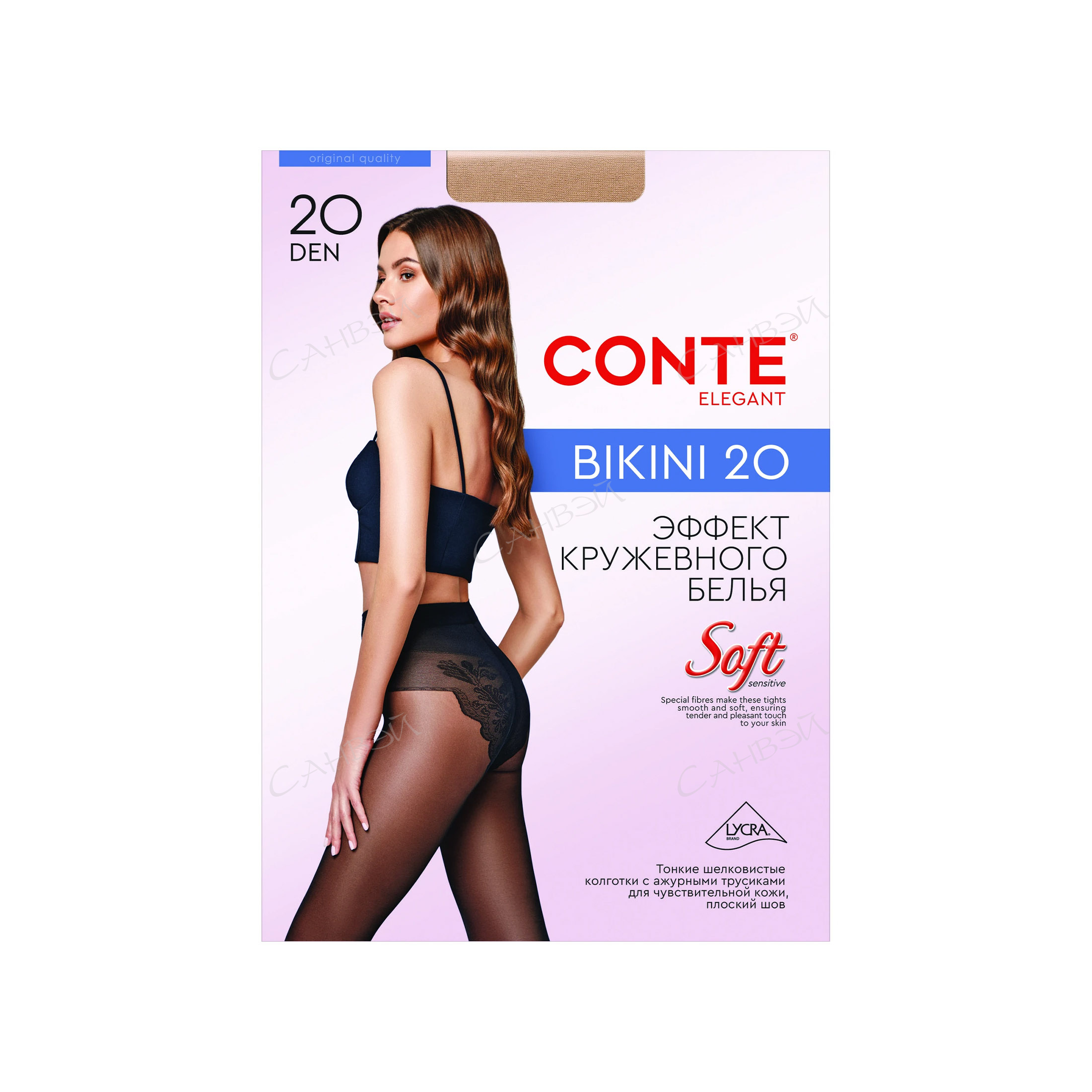 Conte Женские колготки с ажурными трусиками Bikini 20 den Natural размер S -прозрачные колготки с легким блеском и имитацией ажурного нижнего белья связаны из инновационных нитей с улучшенными тактильными свойствами. Шелковистые и чрезвычайно мягкие, колготки BIKINI идеально подходят для чувствительной кожи.