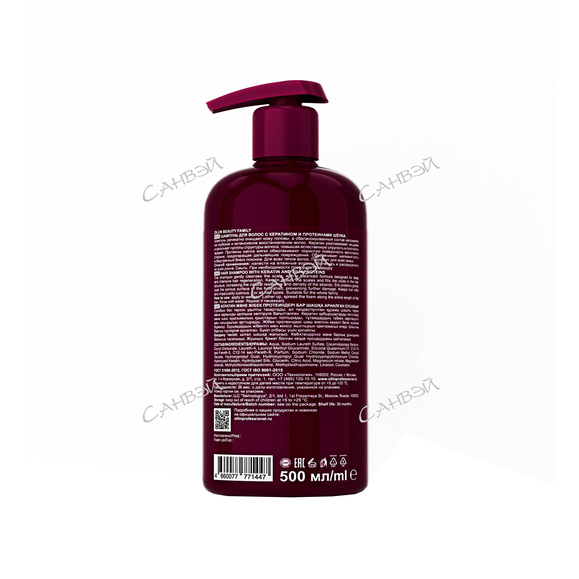 Ollin Professional Шампунь для волос с кератином и протеинами шёлка BEAUTY FAMILY 500 мл. из интернет-магазина Санвэй деликатно очищает кожу головы, а сбалансированный состав направлен на глубокое и интенсивное восстановление волос.