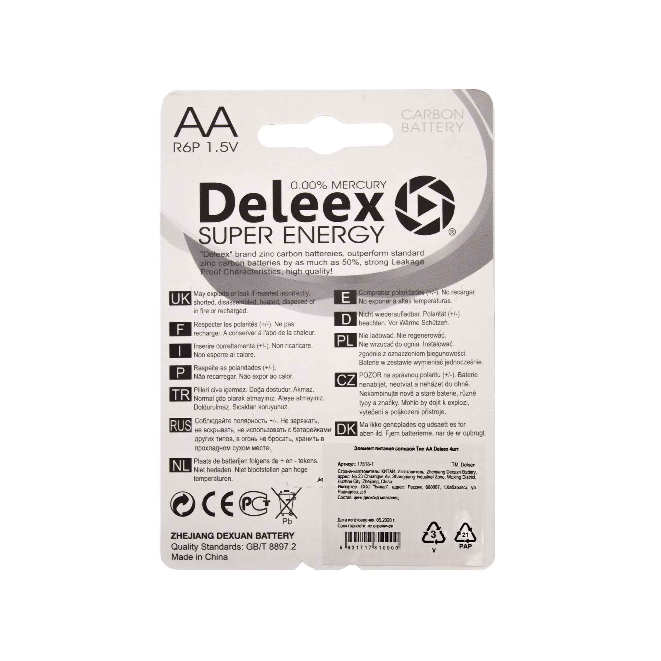 Солевые батарейки Deleex популярного типоразмера AA идеально подходят для приборов с низким потреблением энергии. Рекомендуется использовать в электронных будильниках, пультах ДУ. Форма батарейки: AA (пальчиковые). Типоразмер: AA (пальчиковая, R6, LR6, 316). Технология: солевая. Напряжение: 1.5 В. Количество в упаковке: 4 шт.