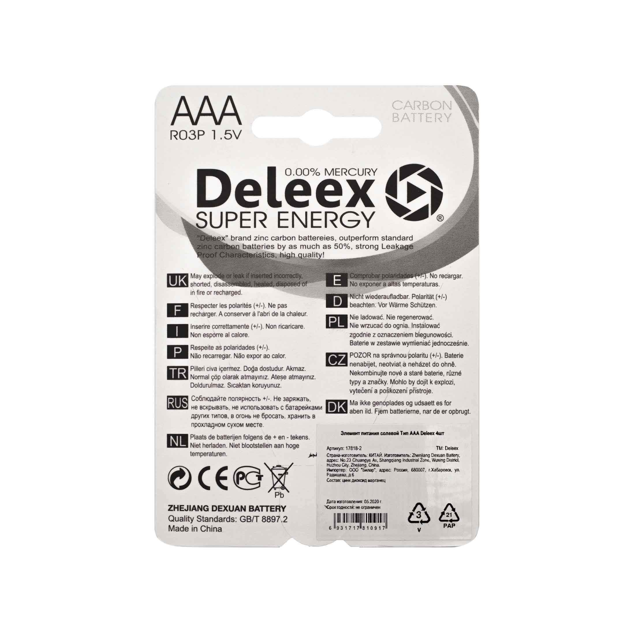 Солевые батарейки Deleex популярного типоразмера AAА идеально подходят для приборов с низким потреблением энергии. Рекомендуется использовать в электронных будильниках, пультах ДУ. Форма батарейки: AAA (мизинчиковые). Типоразмер: AAA (мизинчиковая, R03, LR03, 286). Технология: солевая. Напряжение: 1.5 В. Количество в упаковке: 4 шт.