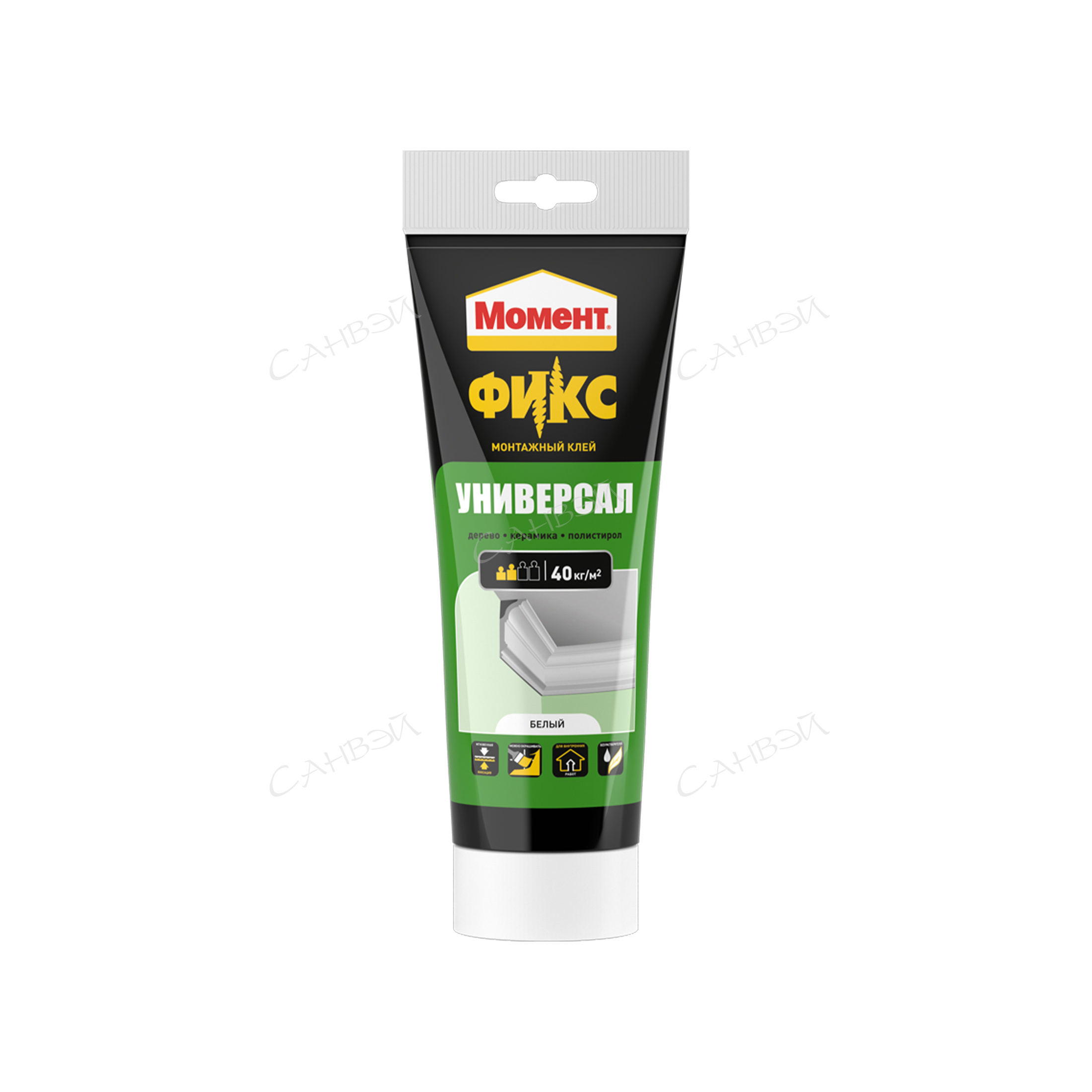 Момент Клей монтажный Фикс Универсал 250 г идеально подходит для крепления потолочной плитки и плинтусов, металлических и деревянных элементов, отделочных панелей, декоративных розеток.