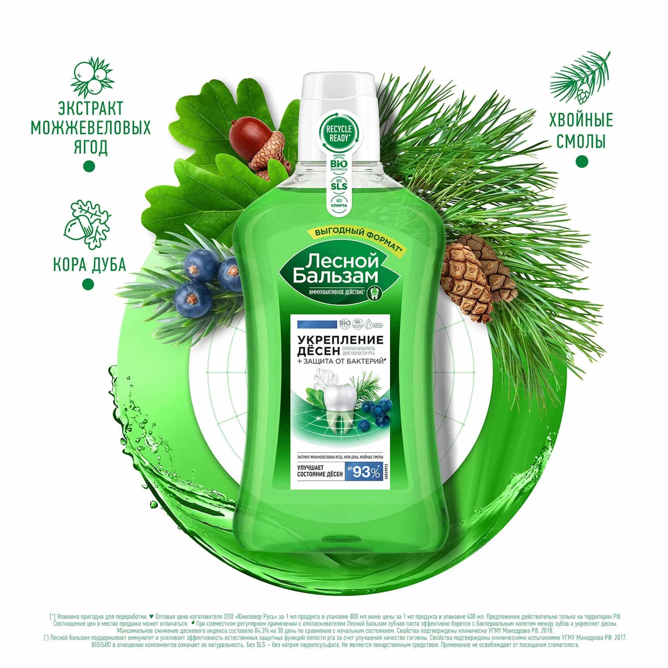 Ополаскиватель для полости рта Лесной бальзам с экстрактом коры дуба, ягод можжевельника и хвойными смолами заботится о здоровье десен, способствует их укреплению, оказывает противовоспалительный и антибактериальный эффект. Формула ополаскивателя для полости рта на 98% состоит из ингредиентов натурального происхождения.