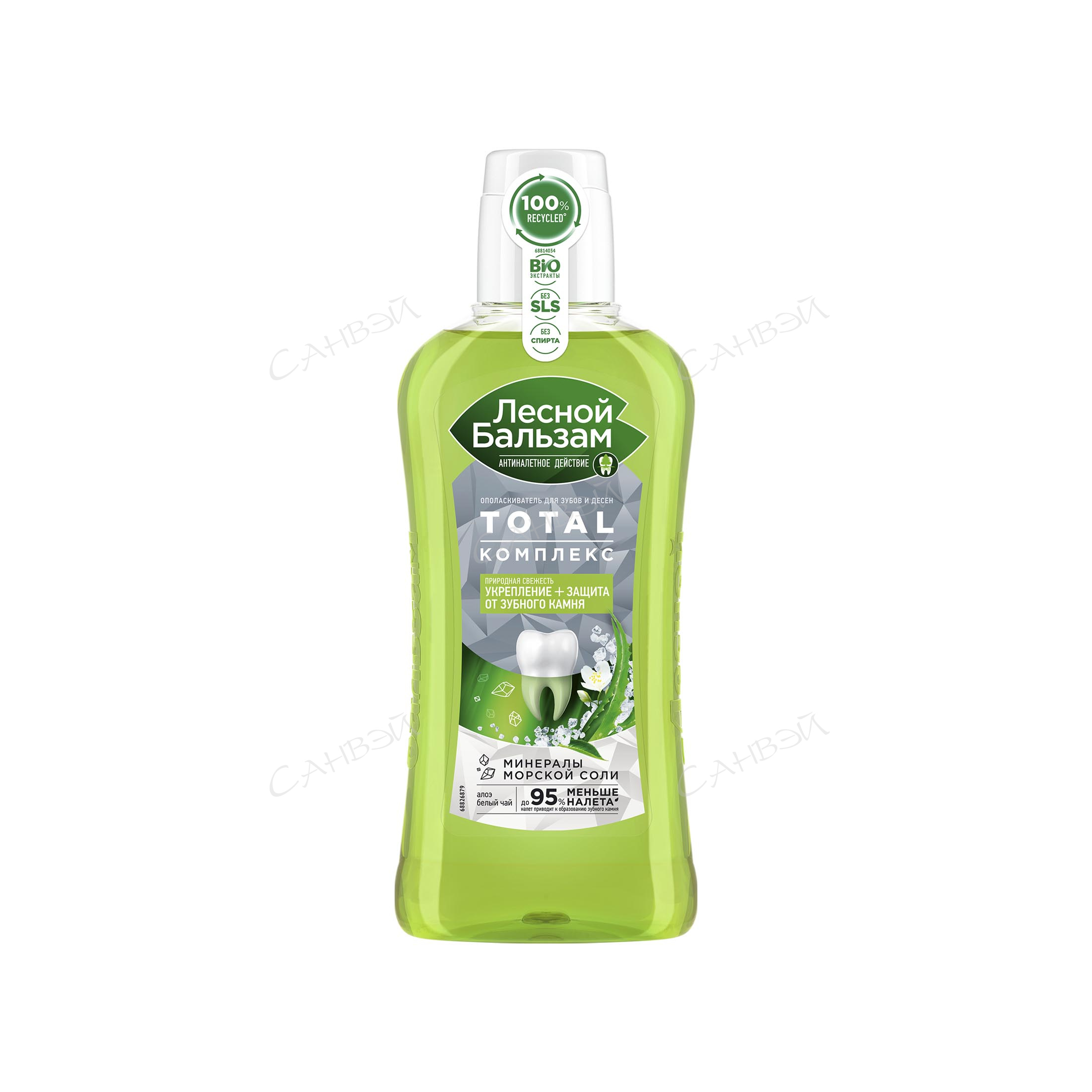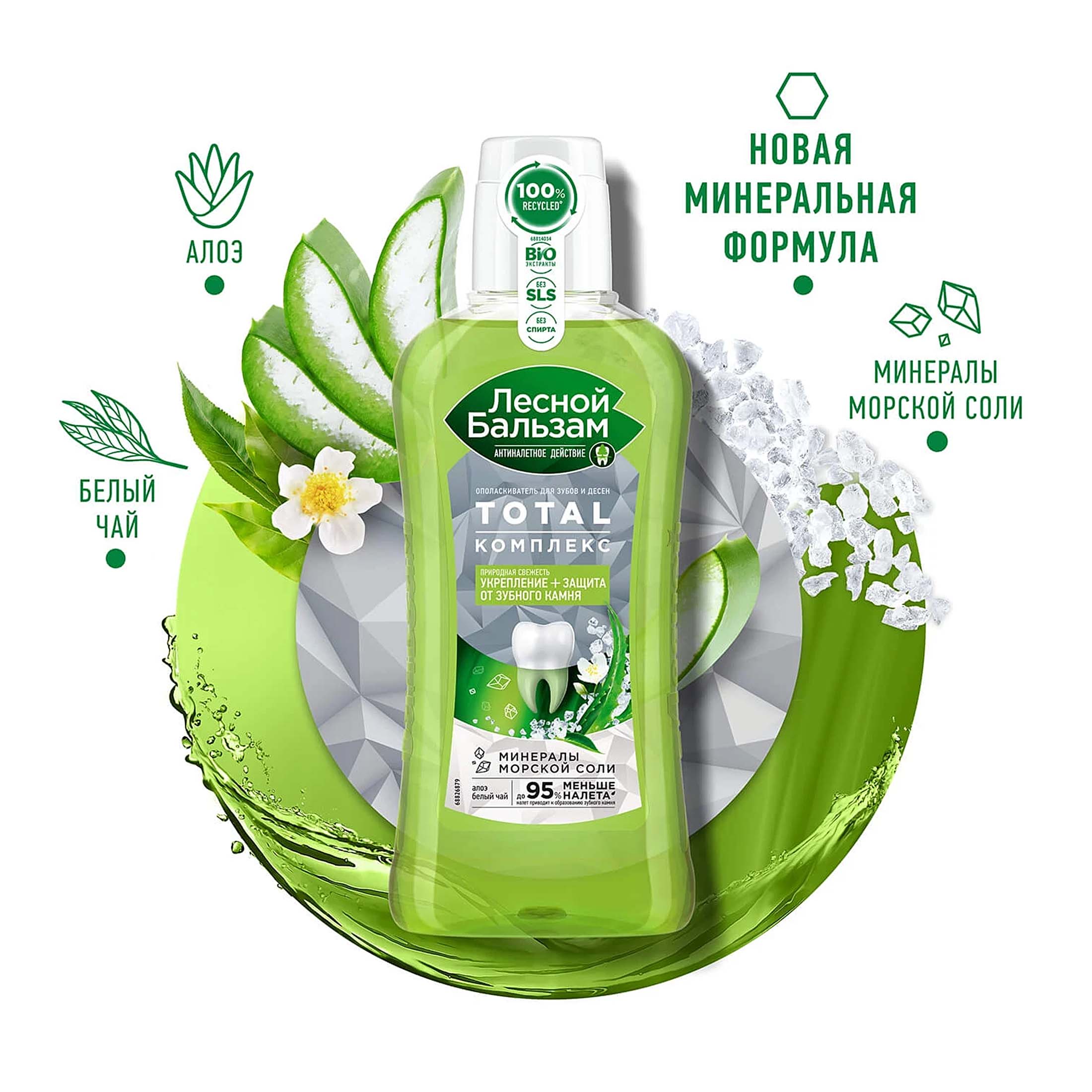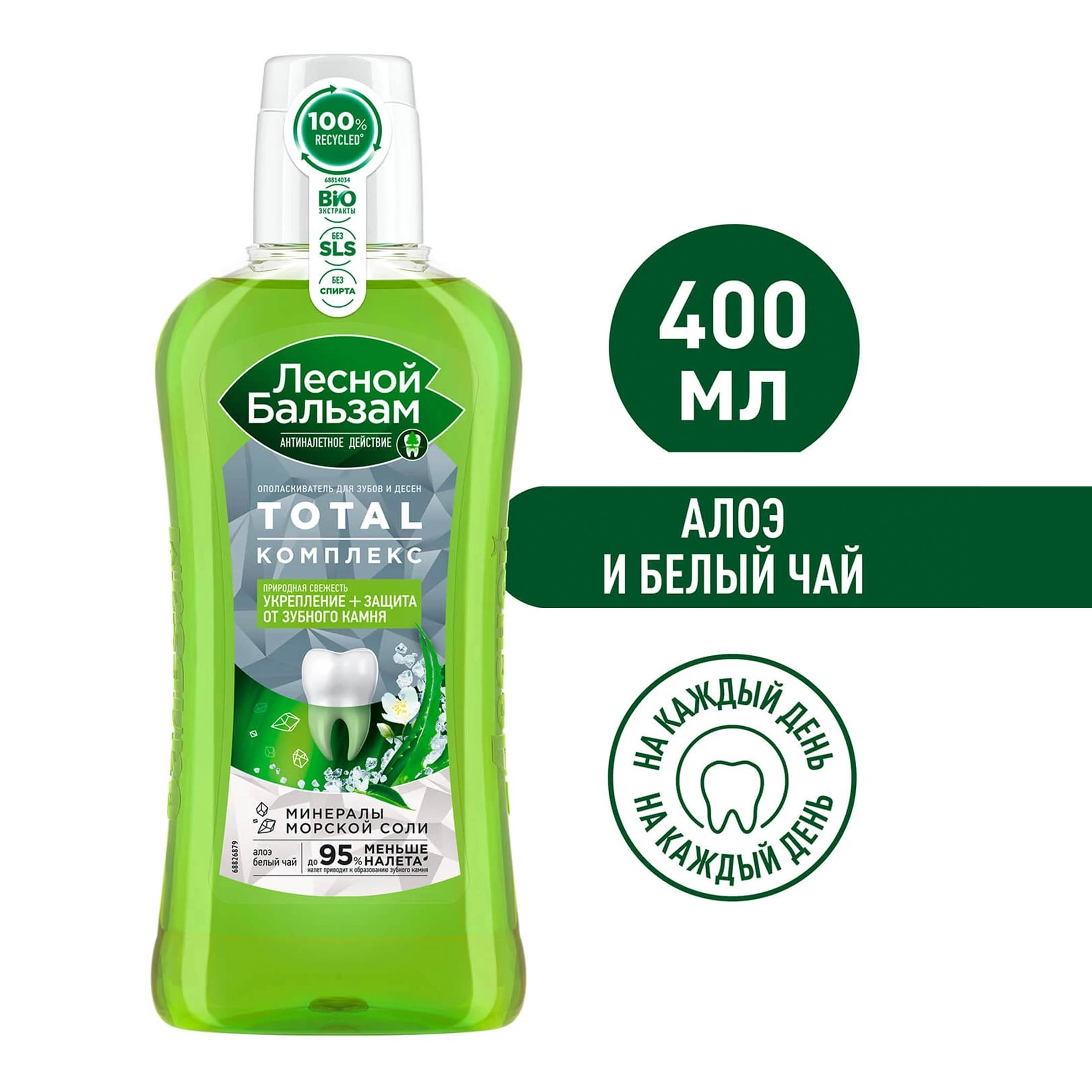 Формула ополаскивателя Лесной бальзам TOTAL Комплекс с морской солью, соком алоэ и экстрактом белого чая эффективно борется с первопричиной развития серьезных проблем полости рта – зубным налетом, эффективно удаляет налет в труднодоступных для щетки местах, снижает скорость появления налета на зубах в течение дня, защищает от зубного камня, укрепляет зубы и десны. На 98% состоит из компонентов природного происхождения, не содержит парабенов и спирта.