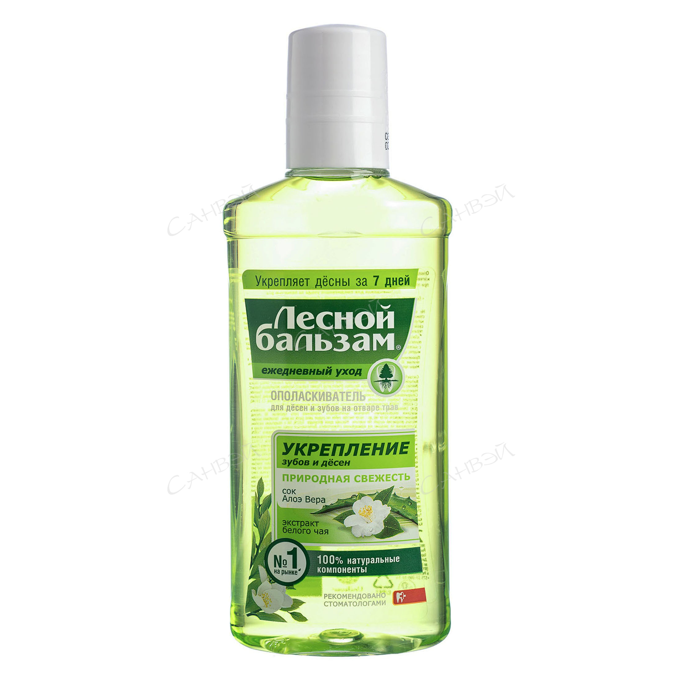 Ополаскиватель Лесной Бальзам "Природная свежесть" содержит в составе на 100% натуральные компоненты, что помогает защитить и укрепить зубную эмаль. Благодаря отвару из 5 целебных трав, ополаскиватель защищает от бактерий, очищает налет в труднодоступных местах и укрепляет ткани десен.