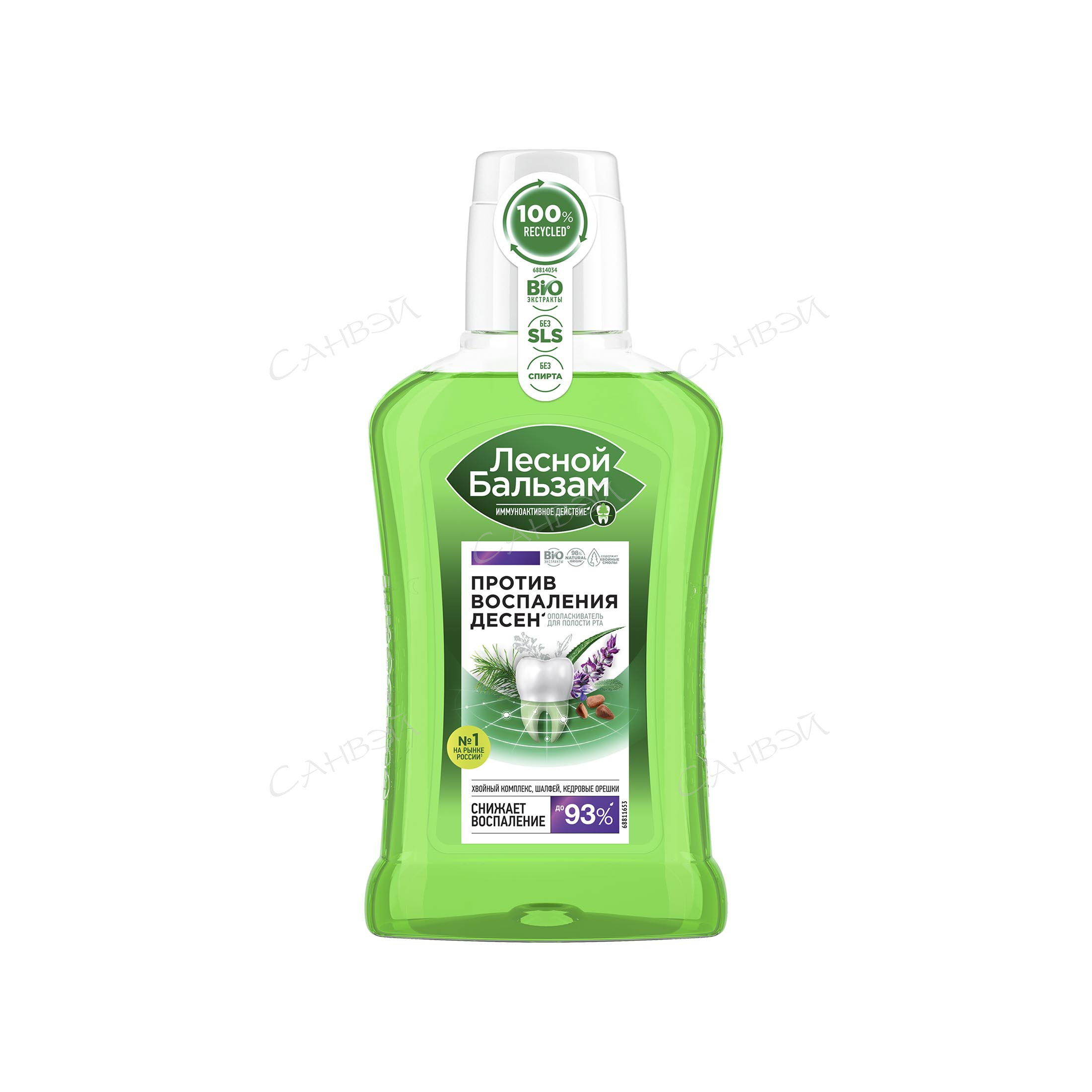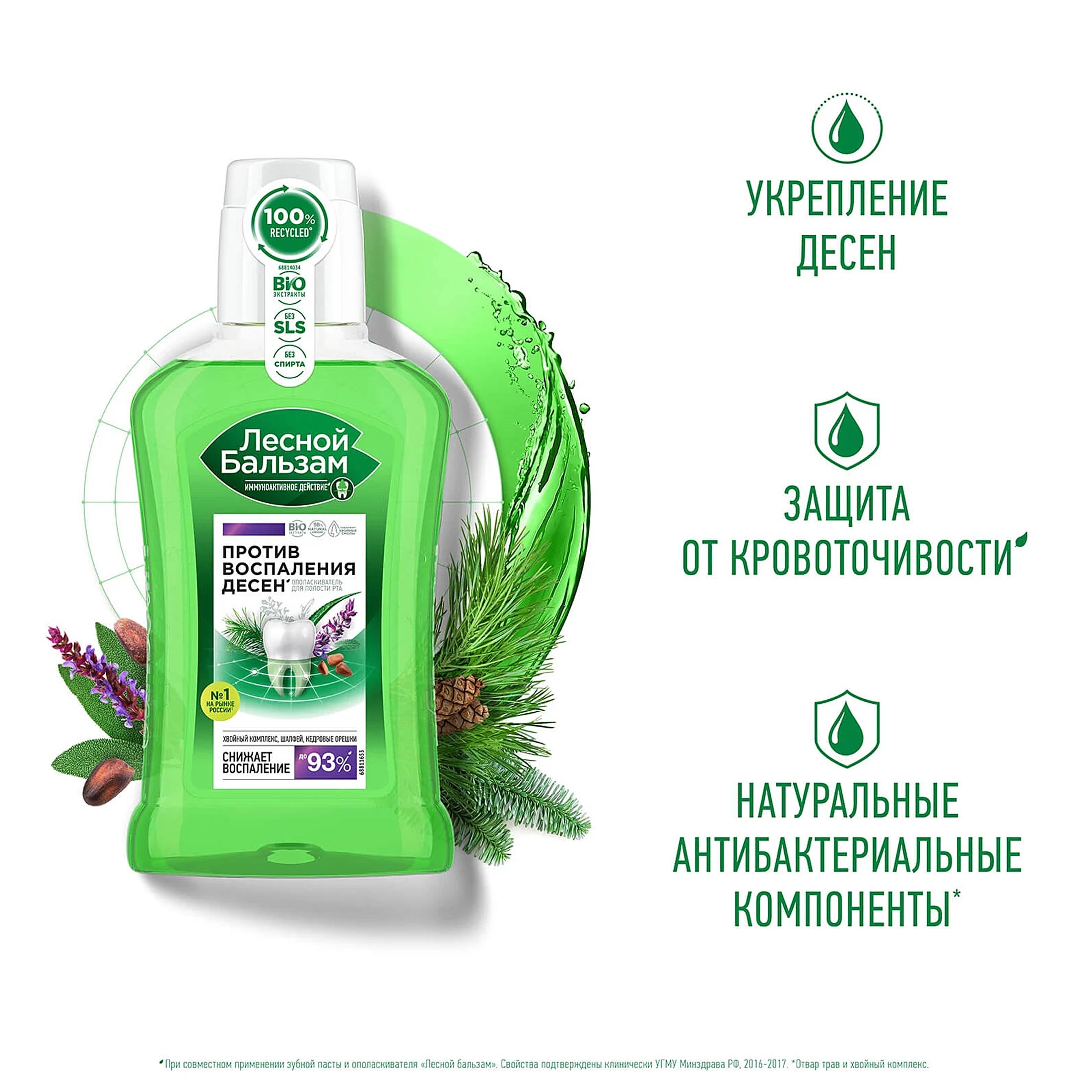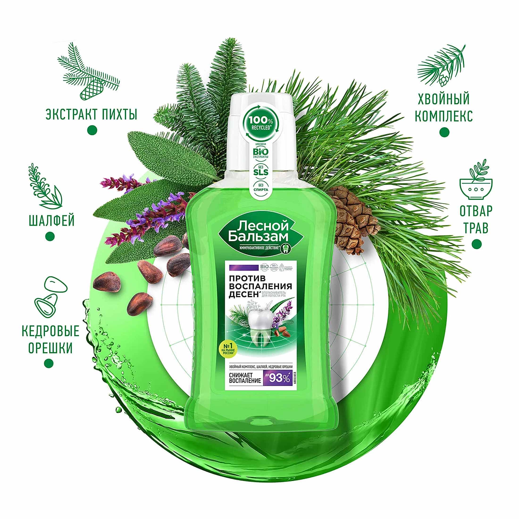 Профилактический ополаскиватель Лесной бальзам на отваре трав с шалфеем - эффективное средство для полоскания десен с выраженным противовоспалительным эффектом. Он обладает иммунноактивным действием и в 2 раза улучшает работу собственного иммунитета полости рта, снижая риск развития проблем с деснами*. *Лесной бальзам поддерживает иммунитет и усиливает эффективность работы естественных защитных функций полости рта. Свойства подтверждены клиническими испытаниями РФ, 2016 - 2017.