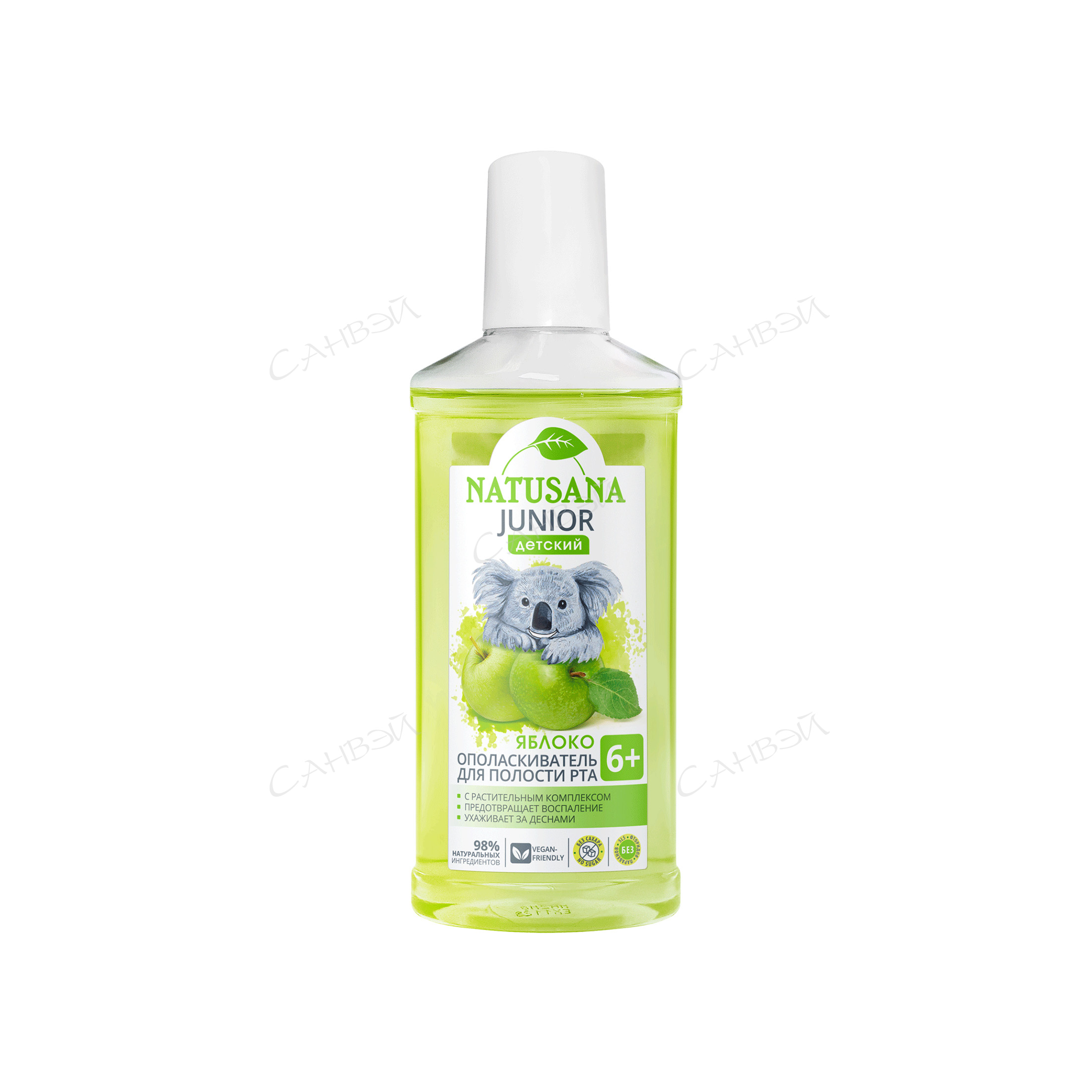 Natusana Ополаскиватель для полости рта детский Junior с витамином Е (6+ лет) Яблоко 250 мл заботится о деснах ребенка, что особенно важно в период смены зубов с временных на постоянные. Экстракты шалфея, ромашки, календулы, алоэ, арники содержат природные антисептики и флавоноиды, которые укрепляют десны, предотвращают их воспаление и способствуют заживлению.