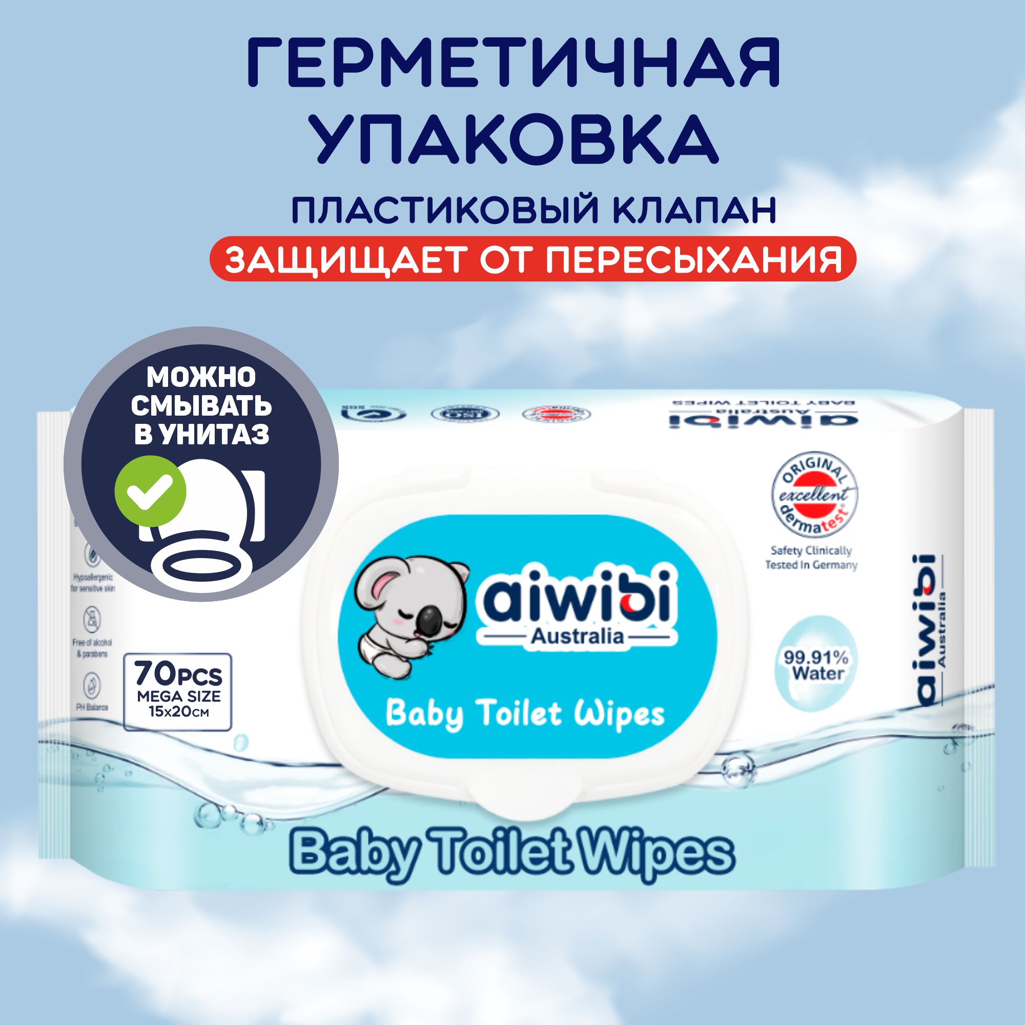 без спирта, можно смывать в унитаз, с алоэ, гипоаллергенно, для детей, с пластиковым клапаном