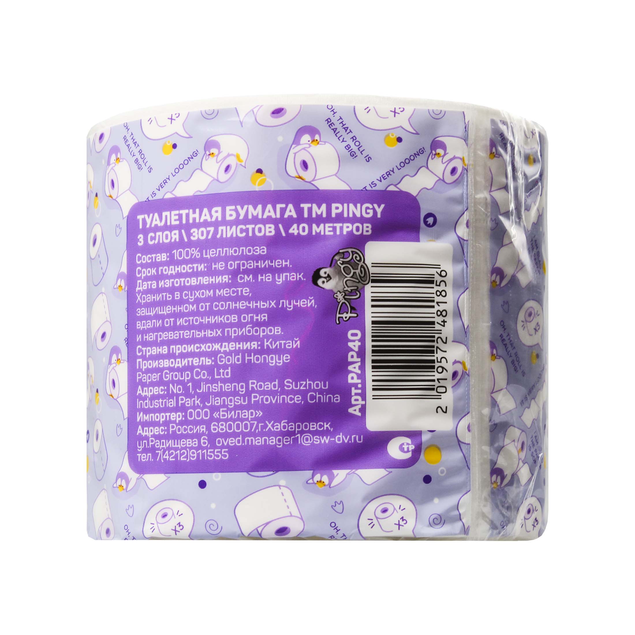 Pingy бумага туалетная 3-х слойн. (на втулке) 40м белая 1рул. п/э / 60шт / PAP40 / 481856