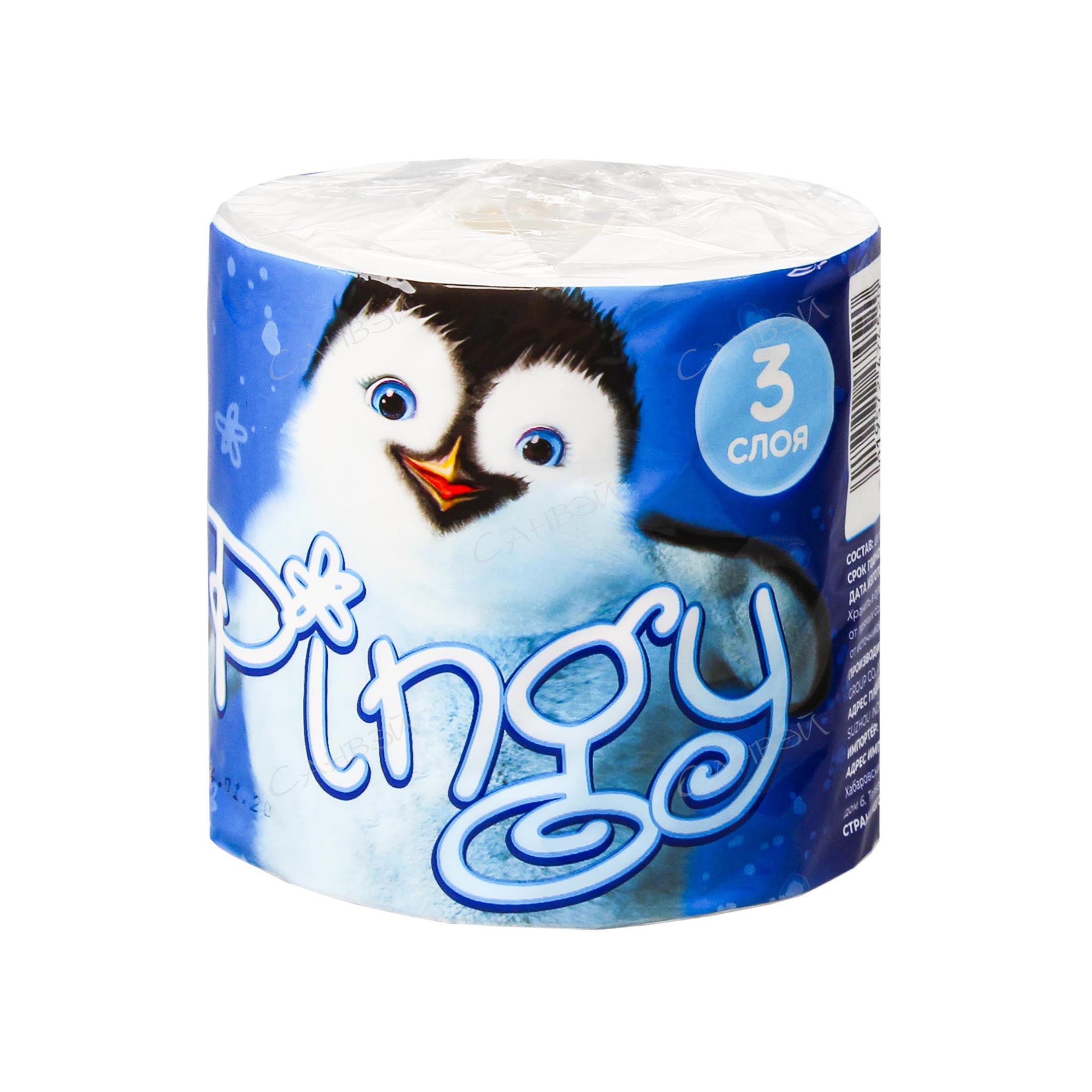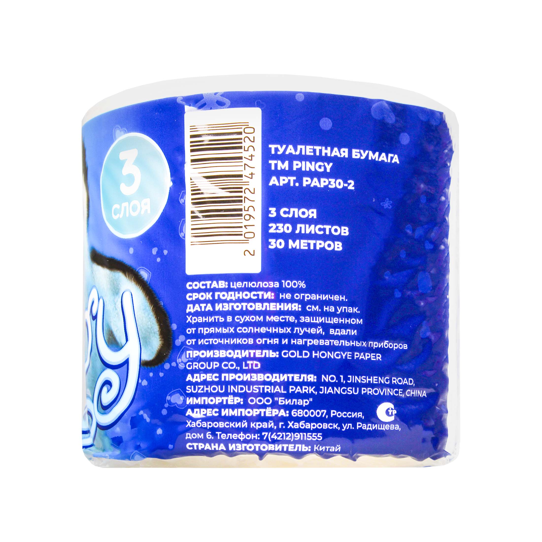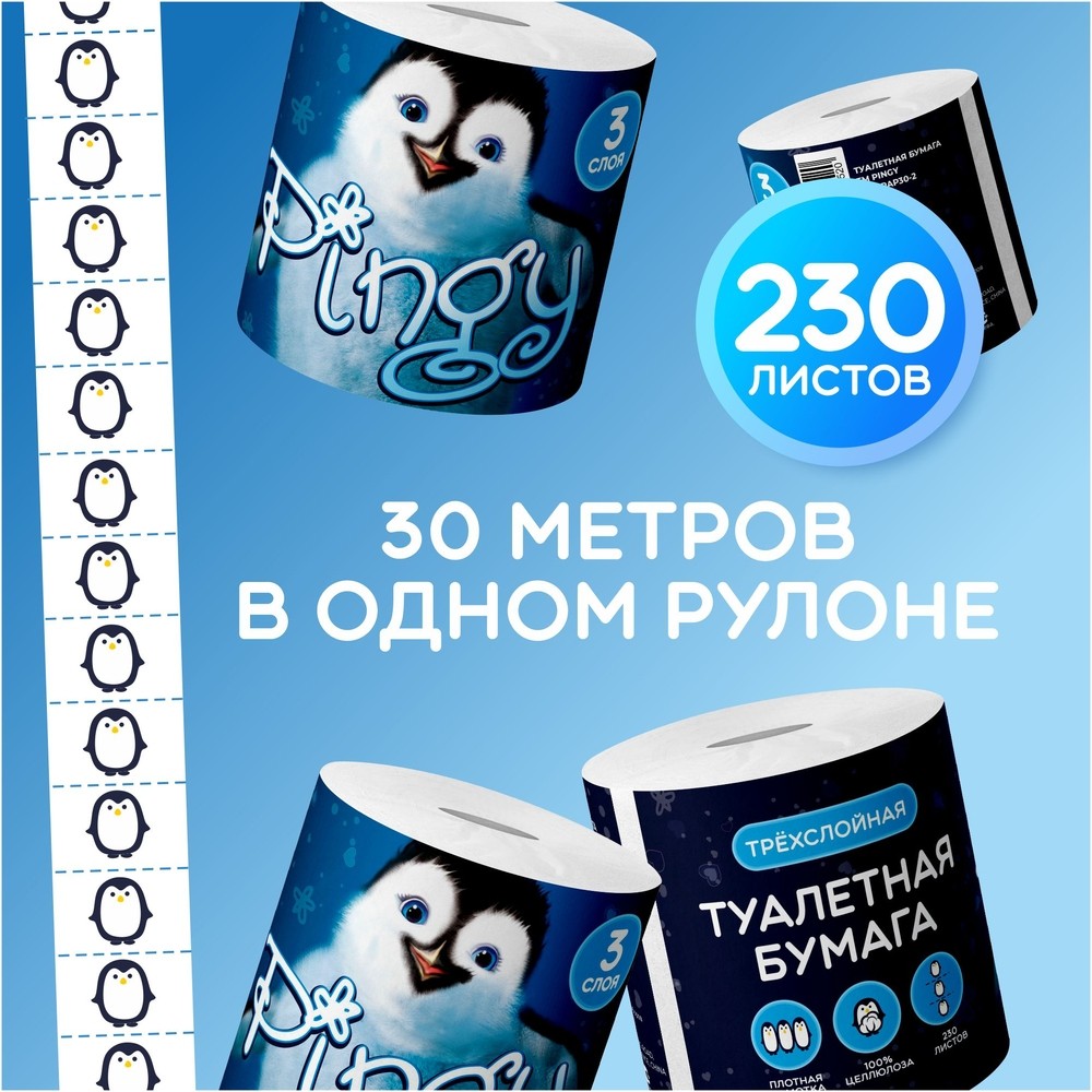 Pingy бумага туалетная 3-х слойн. (на втулке) 30м белая 1рул. п/э / 60шт / PAP30-2 / 474520