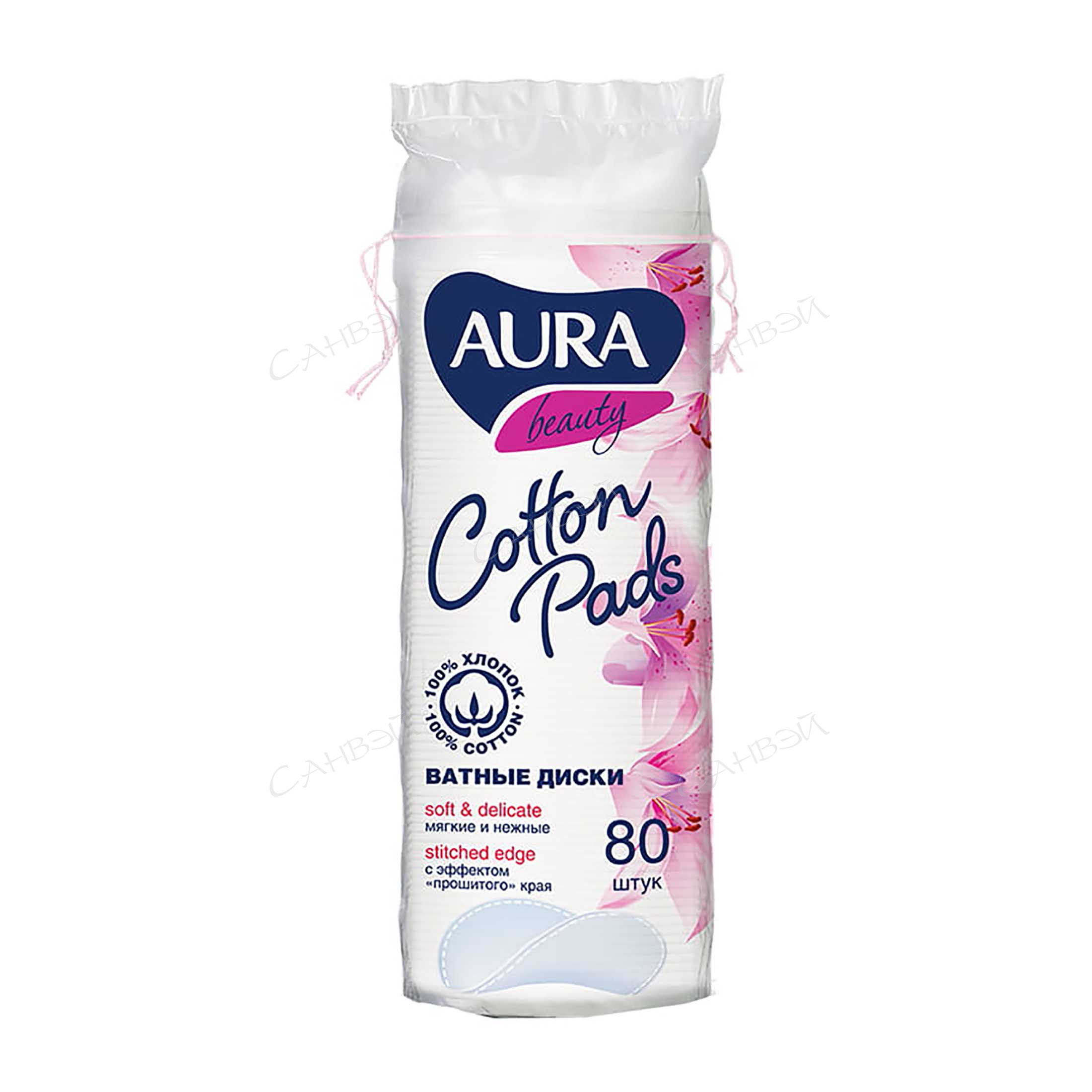 Aura Ватные диски Beauty 80 шт. мягкие и деликатные производятся из 100% хлопка. Благодаря прошитому краю, диски не расслаиваются и не оставляют ворсинок на коже. Диски прекрасно зарекомендовали себя во время снятия макияжа, превосходно очищают кожу. Не вызывают аллергию, а гладкая и нежная поверхность дисков идеально подходит для чувствительной кожи.